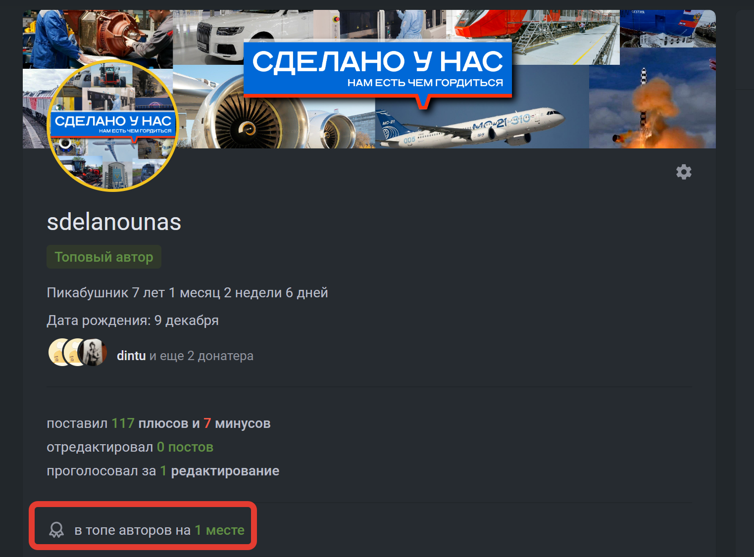 Но конечно, не это заставляет меня тут остаться. Я добрый. И причинять кому-то страдания - не моя мотивация. Куда приятнее вот что: 1-е место в ТОПе авторов. Это значит, что мои посты нравятся, люди хотят знать новости об успехах России, наверное, для многих это стало неожиданностью. Вы еще наших отчетов по новым производствам открытых в каждом месяце не видели :) Так что, спасибо за ваши лайки, за ваши подписки, лайкайте больше, подписывайтесь на сообщество "Сделано у нас", будем вместе тормошить этот гадюшник Пикабу, разбавлять негатив, нести позитив и надежду!