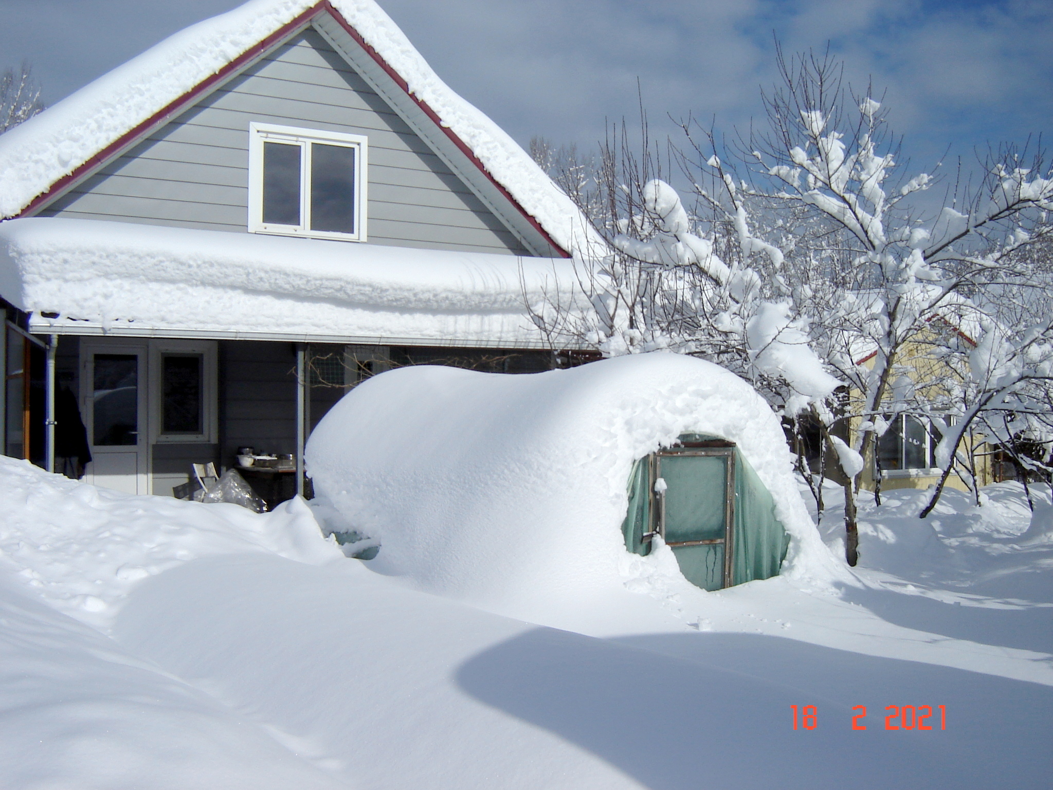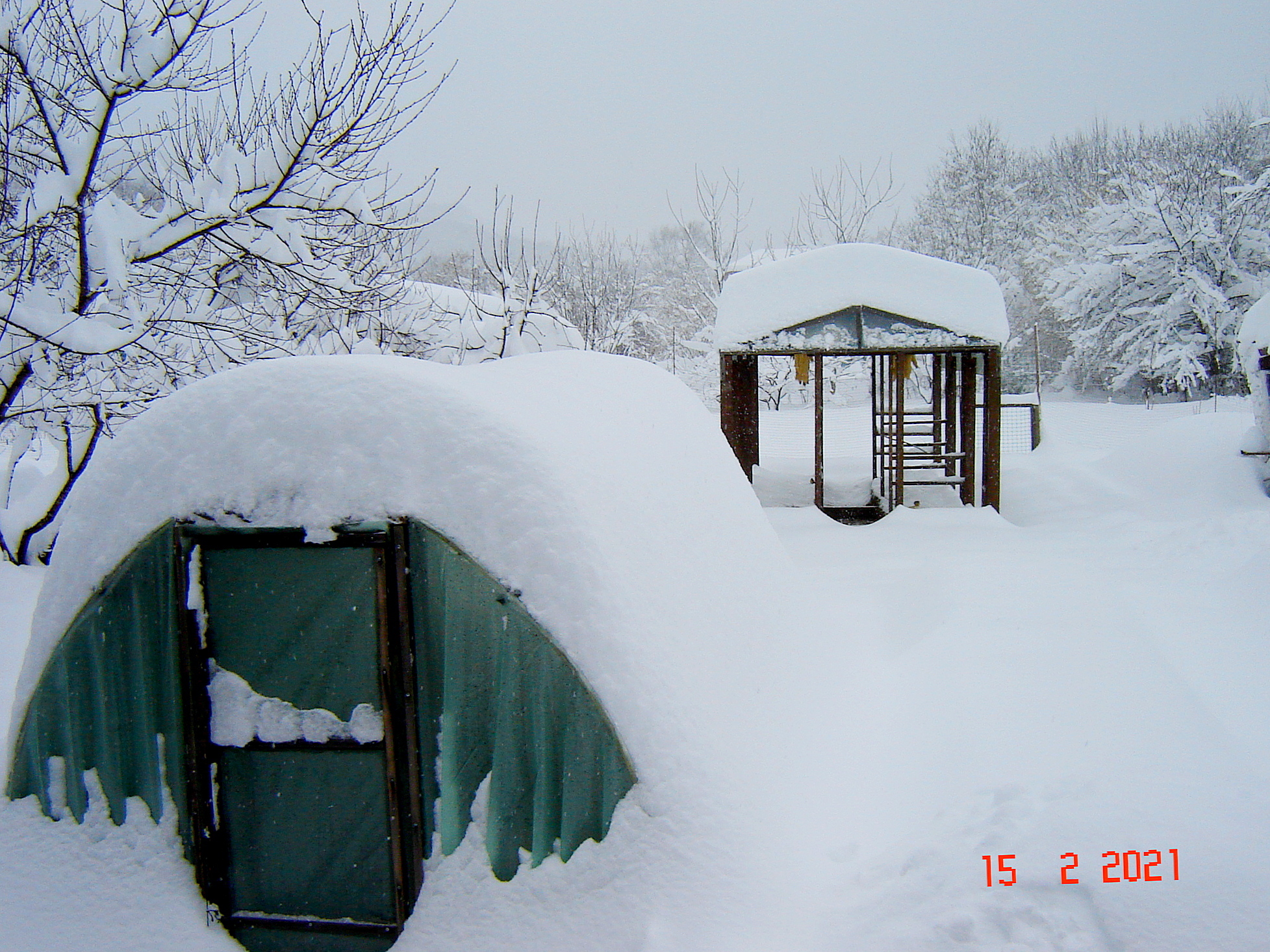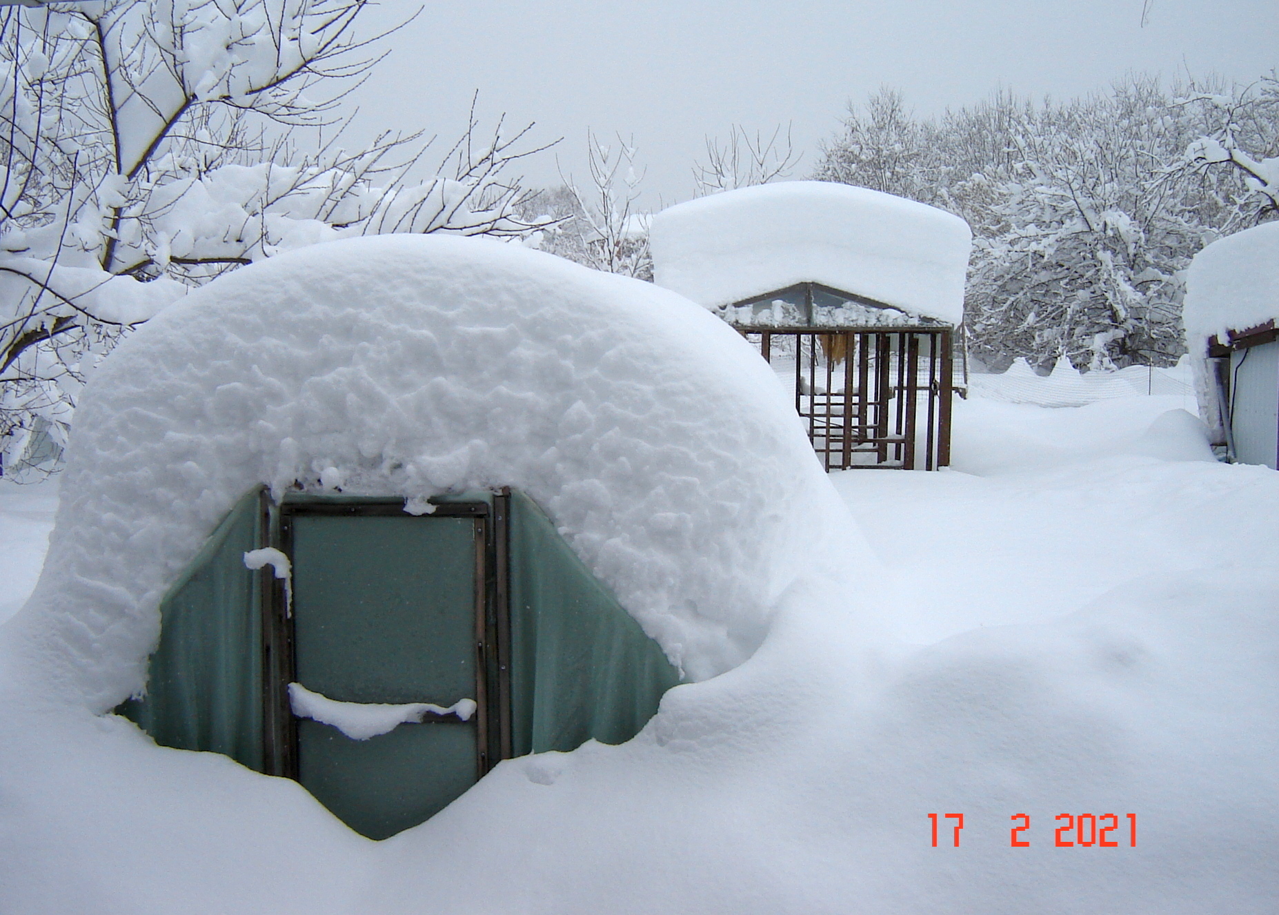В интернете можно найти много фото, где поликарбонатные теплицы на металлическом каркасе "складываются" под тяжестью снега. За последние дни очень много снега выпало в наших краях, и моя тепличка на каркасе из труб ППР прошла испытание огромной массой снега, которого еще не было на ее веку. Надо сказать, что за четыре дня, что валил снег, я ее не чистил ни разу. Не хватало ни времени, ни сил. Столько на нас обрушилось снега, что я целыми днями чистил только придомовую территории и только одну из наших трех зимних теплиц. И то не успевал....