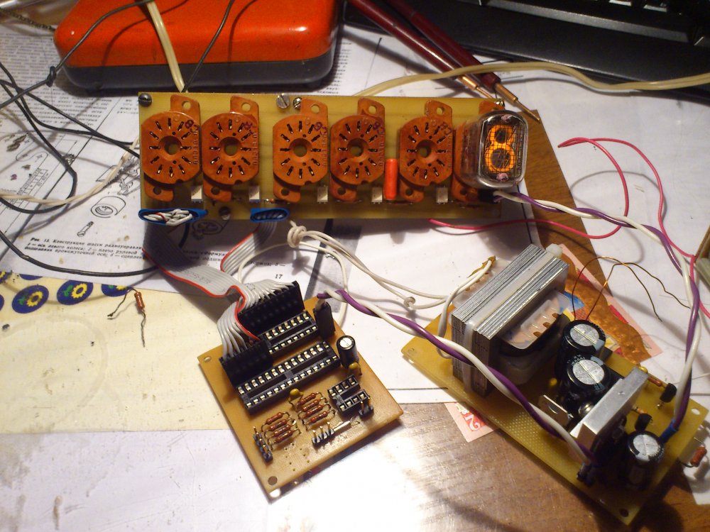 О как кстати, у меня есть 12 ламп ИН-14, не подскажете где можно взять схему платы для часов ? У вас какие индикаторы использовались ?