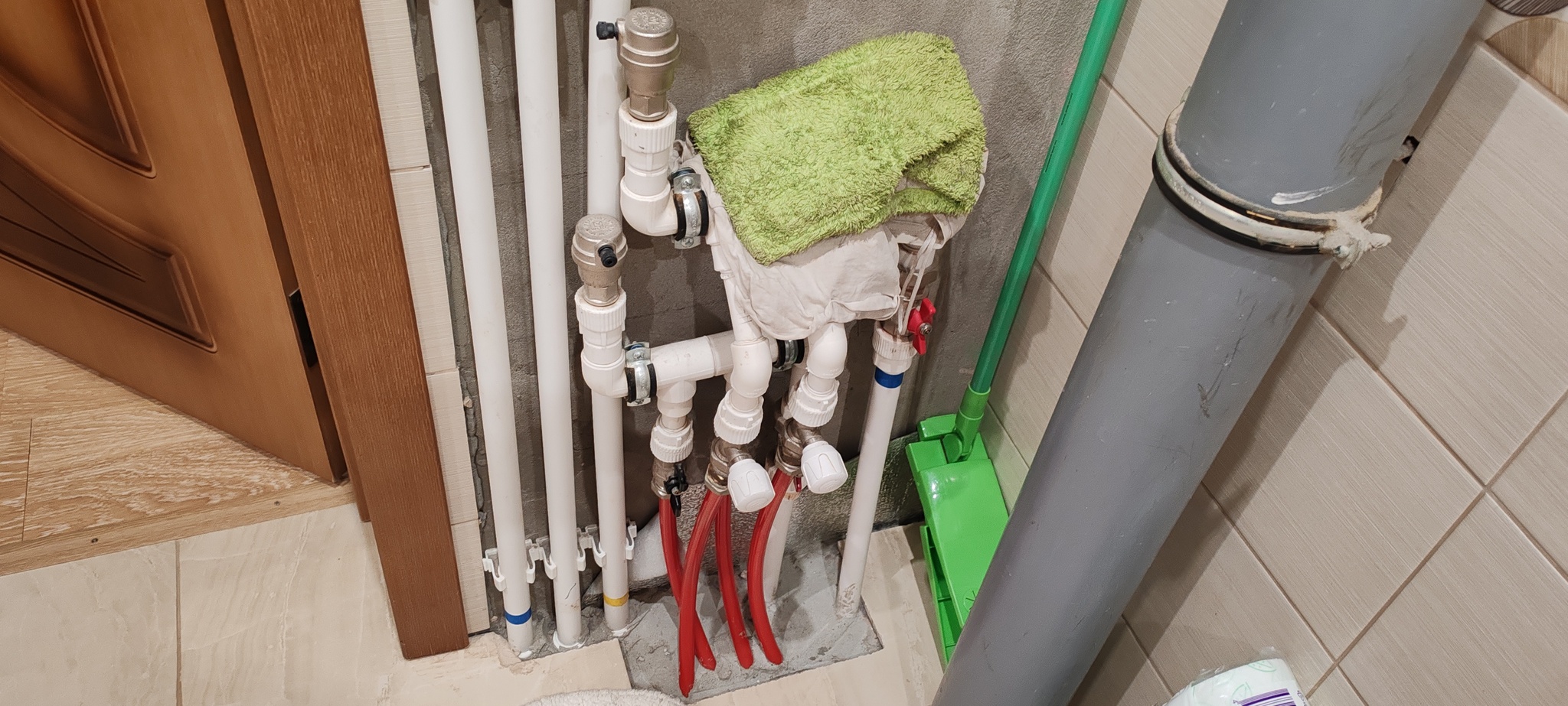 Однажды , я поехал в гости к своему другу, который построил свой большой дом и уже несколько лет в нем жил ( и сейчас живает). После вечерних посиделок друг предоставил мне шикарный диван на первом этаже в огромной комнате со вторым светом, в этой же комнате  работали тёплые полы. Признаюсь ,что я не спал всю ночь, было очень душно, жарко, пробовал перебираться в кухню-гостинную, а там такая же тема- теплые полы. С утра сказал , что было жарковато, друг ответил ,что в большой комнате убавил на минимум. Напрашивался вывод, что не стоит делать теплые полы на кухне, в спальной комнате и гостиннной, лучше как следует утеплить сам пол, а вот в коридоре и в ванной комнате тёплые полы даже очень нужны. Оставалось решить несколько технических моментов: как  правильно сделать стяжку, как уложить трубки, где поставить распределительный коллектор, ну и как вывести плиточный пол в один уровень с основным из ламината, чтобы не было всяких порогов, чтобы нормально ходить, не спотыкаться.
