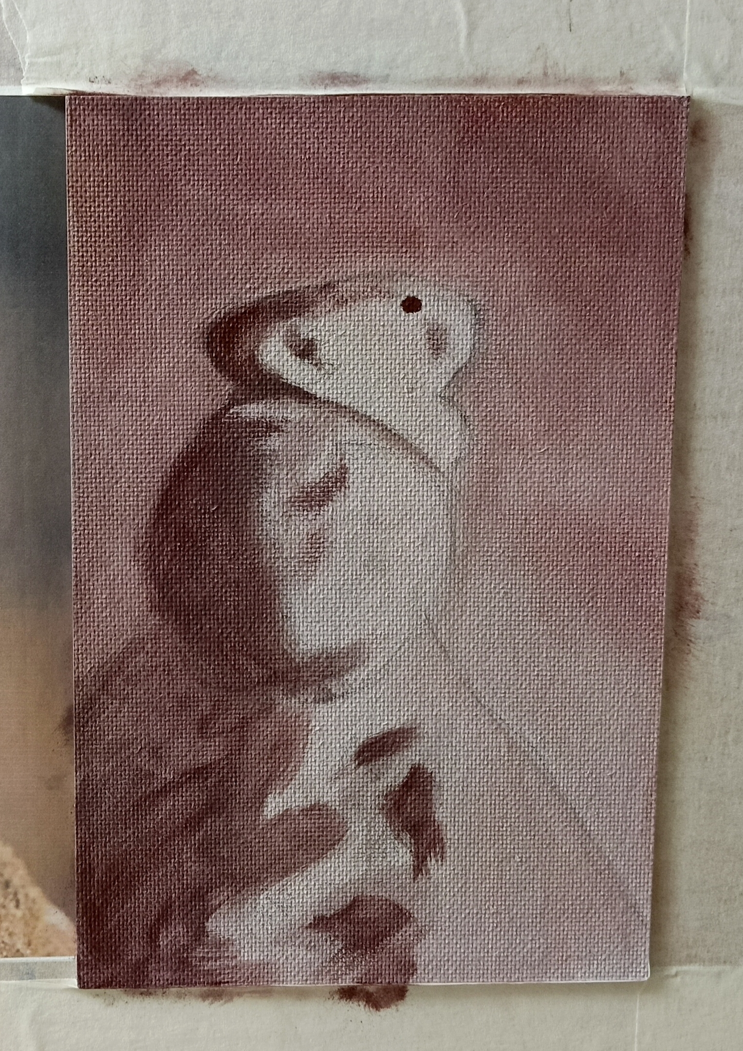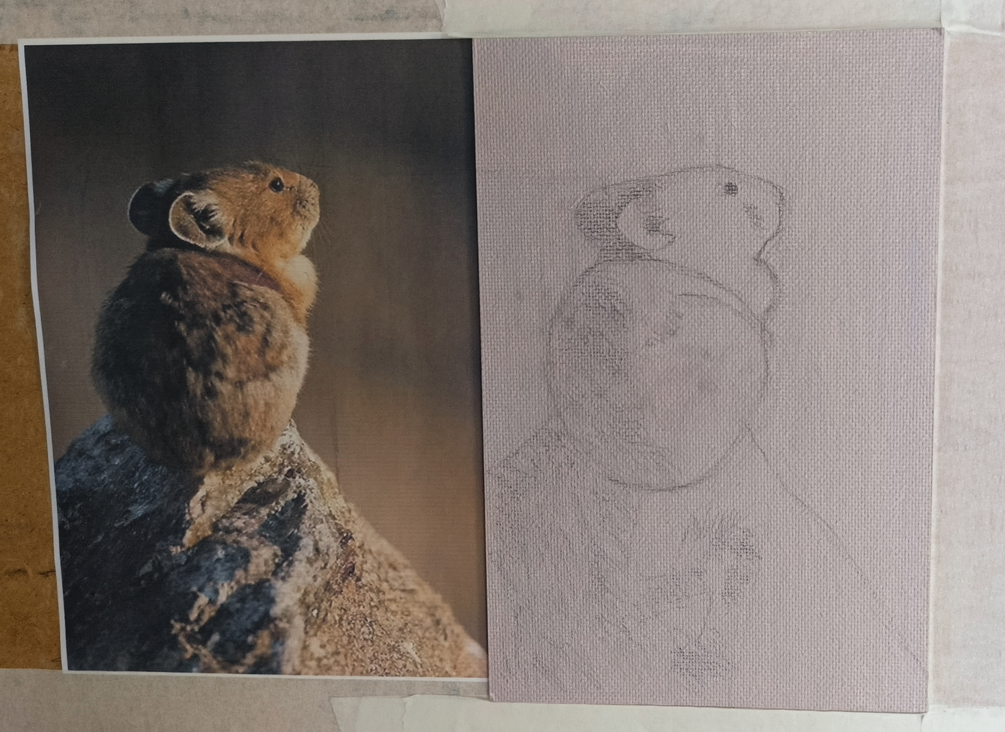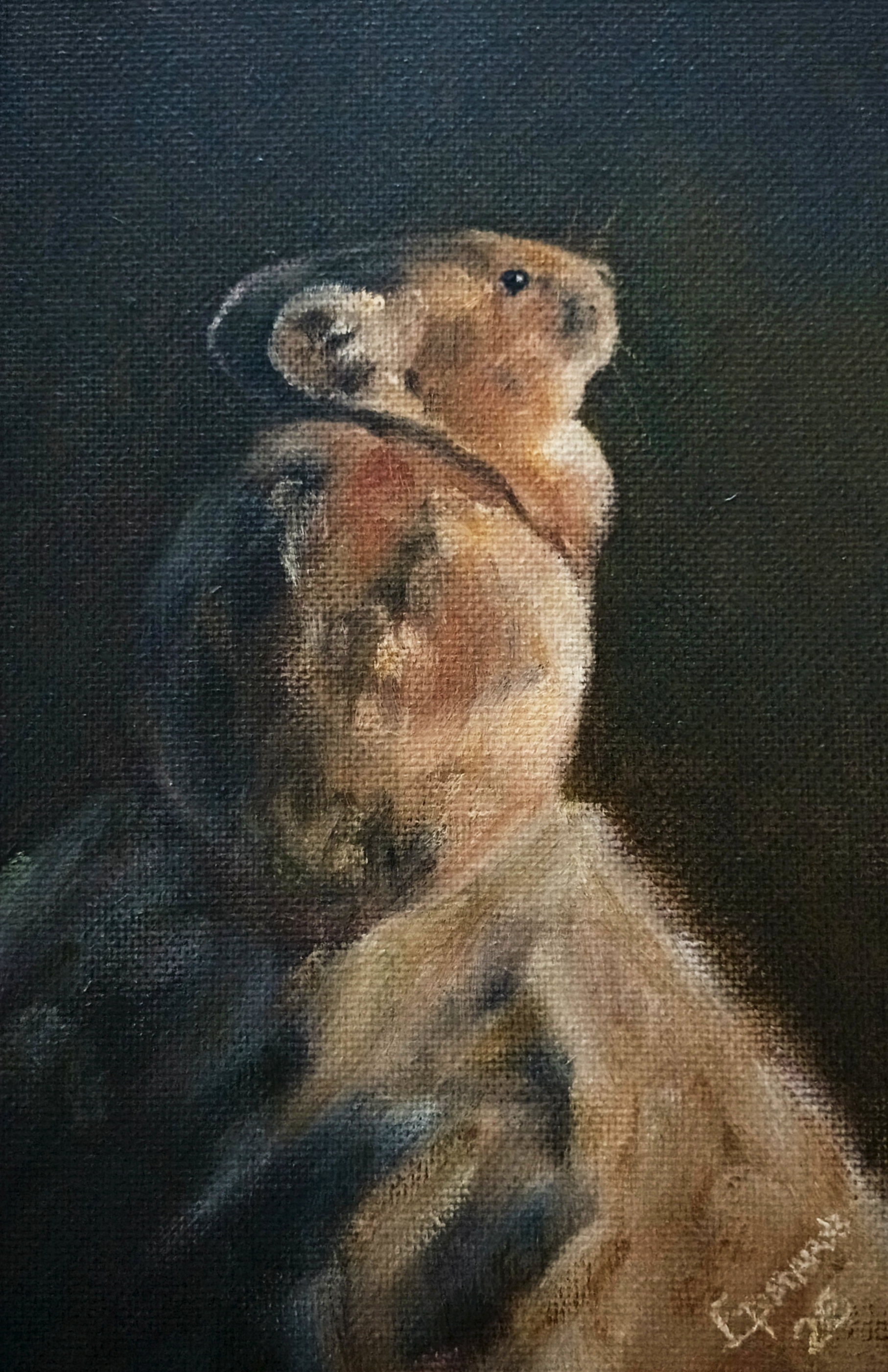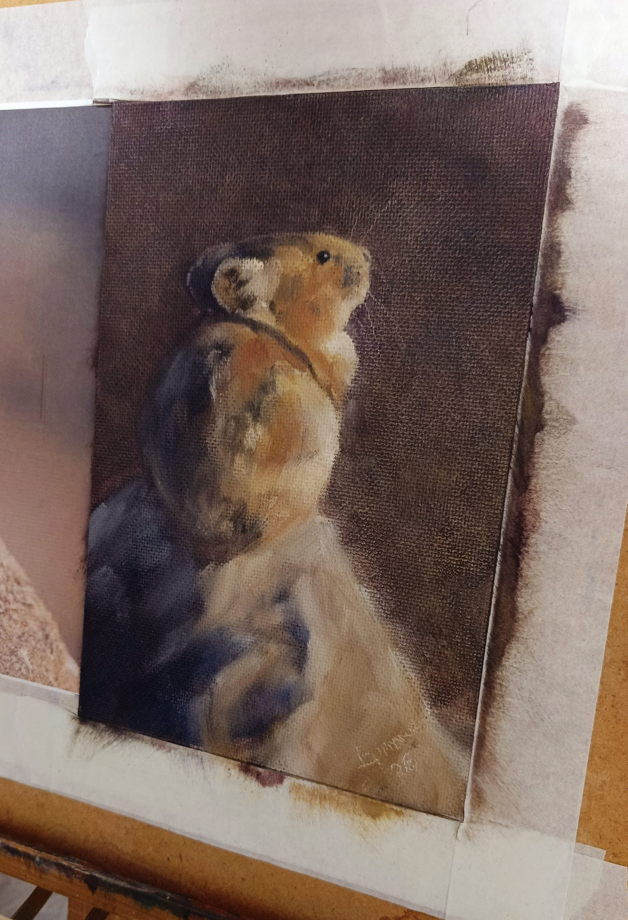 Кроме того, привычная для меня тонкая заливка фона как будто не работает на такой поверхности, все выступающие части были почти цвета грунта, при том что в углублениях достаточно темный замес из капут мортуума, ультрамарина и умбры. На следующий день, когда масло впиталось, фон стал совсем светлым и не таким, каким я его пытался сделать. Поэтому после высыхания пришлось делать дополнительную лессировку, чтобы уплотнить тон, и я для цветового контраста сделал её зелёным цветом, добавив его же в тени, чтобы вписать пищуху в пространство.