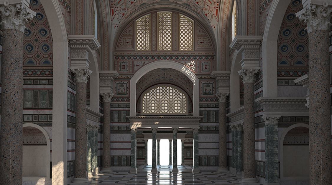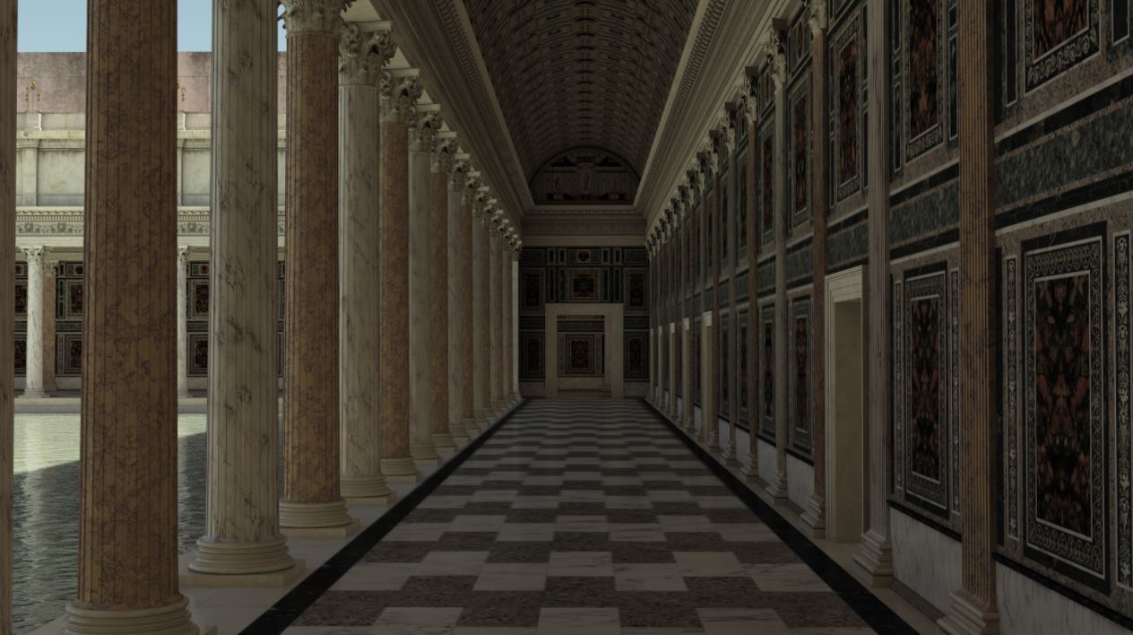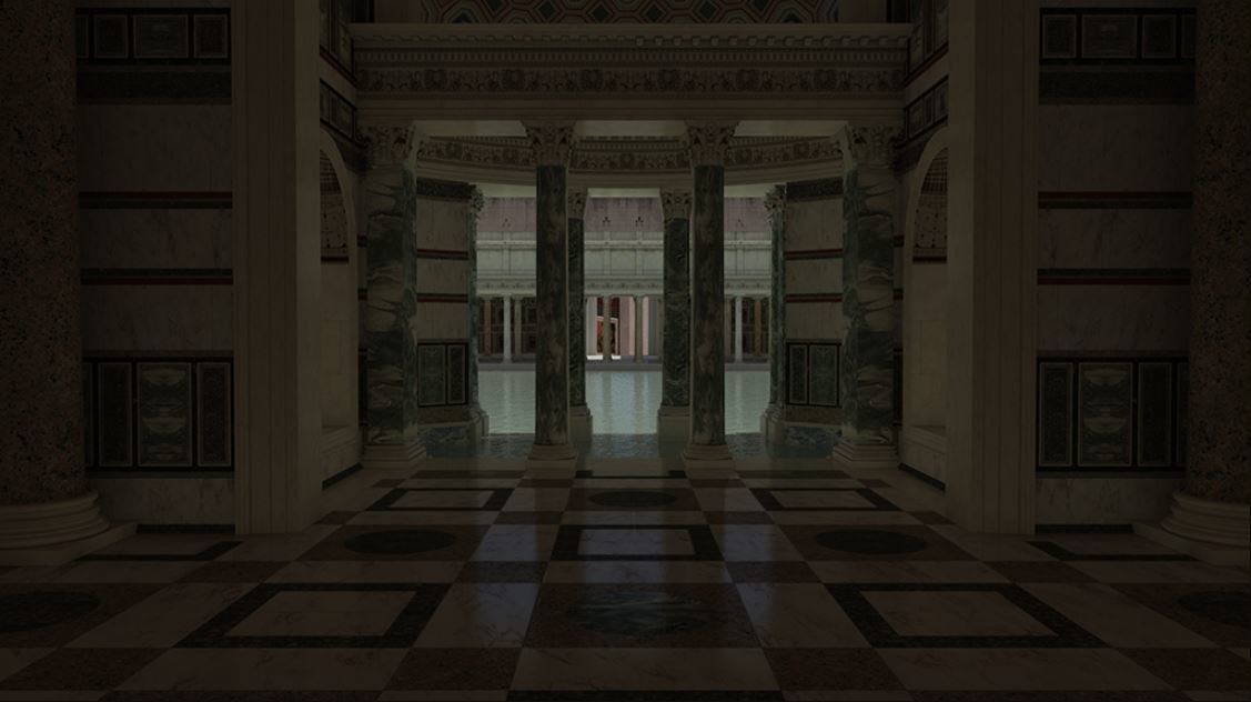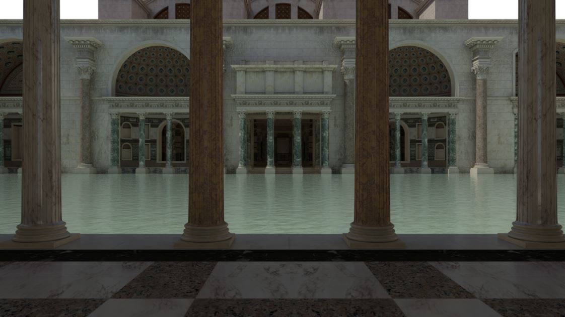 Сразу после входа в термы виден огромный бассейн. Словно залили водой целую площадь. Вновь напрашивается сравнение с Венецией. Представьте площадь Сан-Марко, затопленную наводнением, с отраженными зеркальной поверхностью водной глади портиками. Это natatio, бассейн глубиной один метр, который является одним из элементов термальных процедур. Но многие люди пользуются этим местом, просто чтобы расслабиться, поболтать с друзьями, окунуться в прохладную воду в жаркий день.