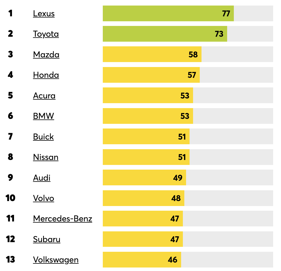 В тройке лидеров: Lexus , Toyota и Mazda, получившие средний рейтинг надежности 77, 73 и 58 (из 100) соответственно. За ними следуют Honda (57) и Acura (53), замыкая пятерку.