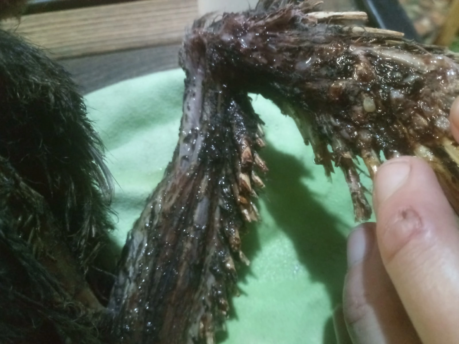 Ожоги на крыле начали засыхать и трескается, соответственно немного кровоточат. Обрабатываем препаратом из нового назначения. Спасибо орнитологу из Мурманска, сделала назначение без инъекций, птичке и так больно.
