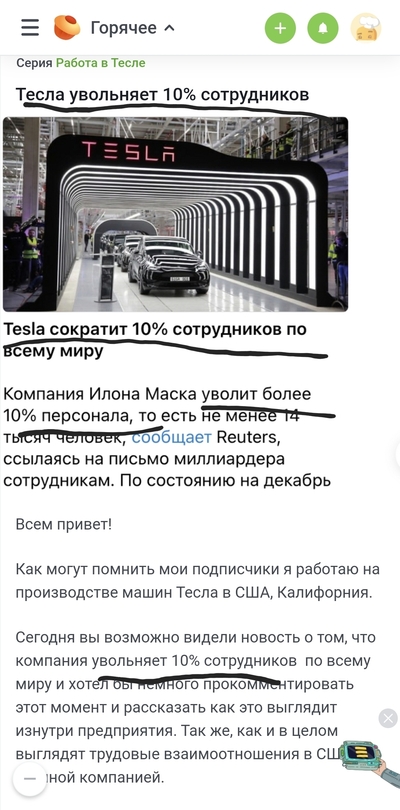 Суммарно в компании Тесла по всему миру работает порядка 140000 человек, то есть под сокращение попали 14 тысяч, что конечно много. Как ни странно, конкретно в локации где работаю я это тоже заметно, причем не только на базовых должностях, но и выше. Сегодня узнал что сократили HR и супервайзера второй смены, это помимо мои коллег которых я видел на улице. Про них тоже история вышла печальная, многие, как и я не читали почту на выходных и узнали о своем сокращении по сути у входа на работу рано утром - наверное хреновее понедельника и представить нельзя.