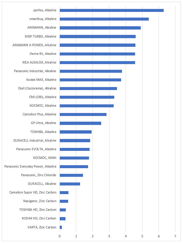 На графике видно, что батарейки Zinc Carbon и Zinc Chloride покупать никакого смысла нет.