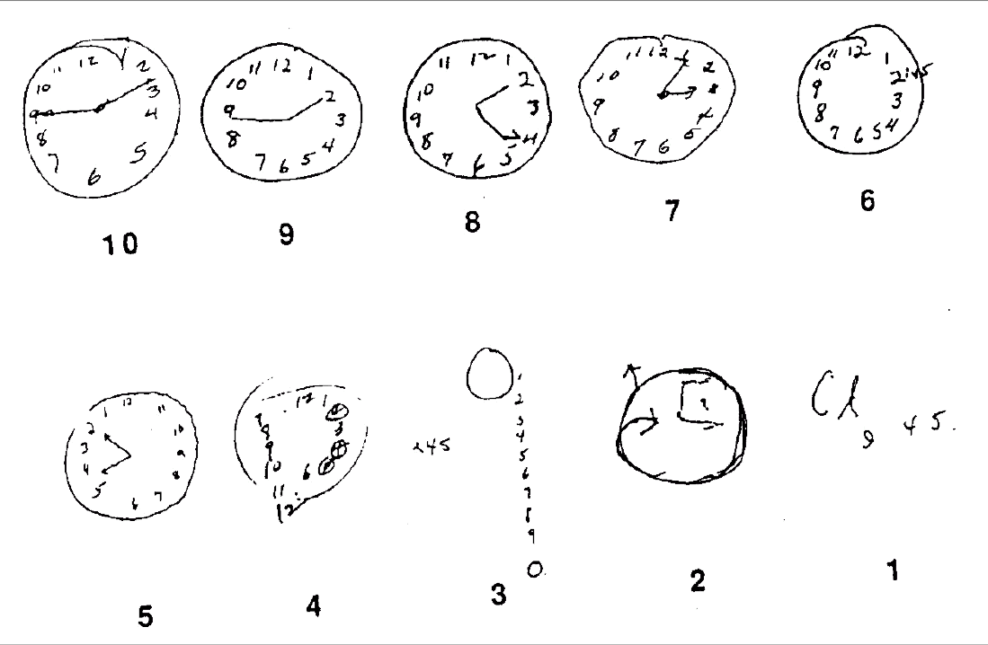 В начале теста пациенту говорят 3 слова (в некоторых случаях 5) и просят их запомнить. Затем пациенту нужно нарисовать циферблат и расположить на нём цифры в соответствующих местах, а так же отметить стрелками нужное время.