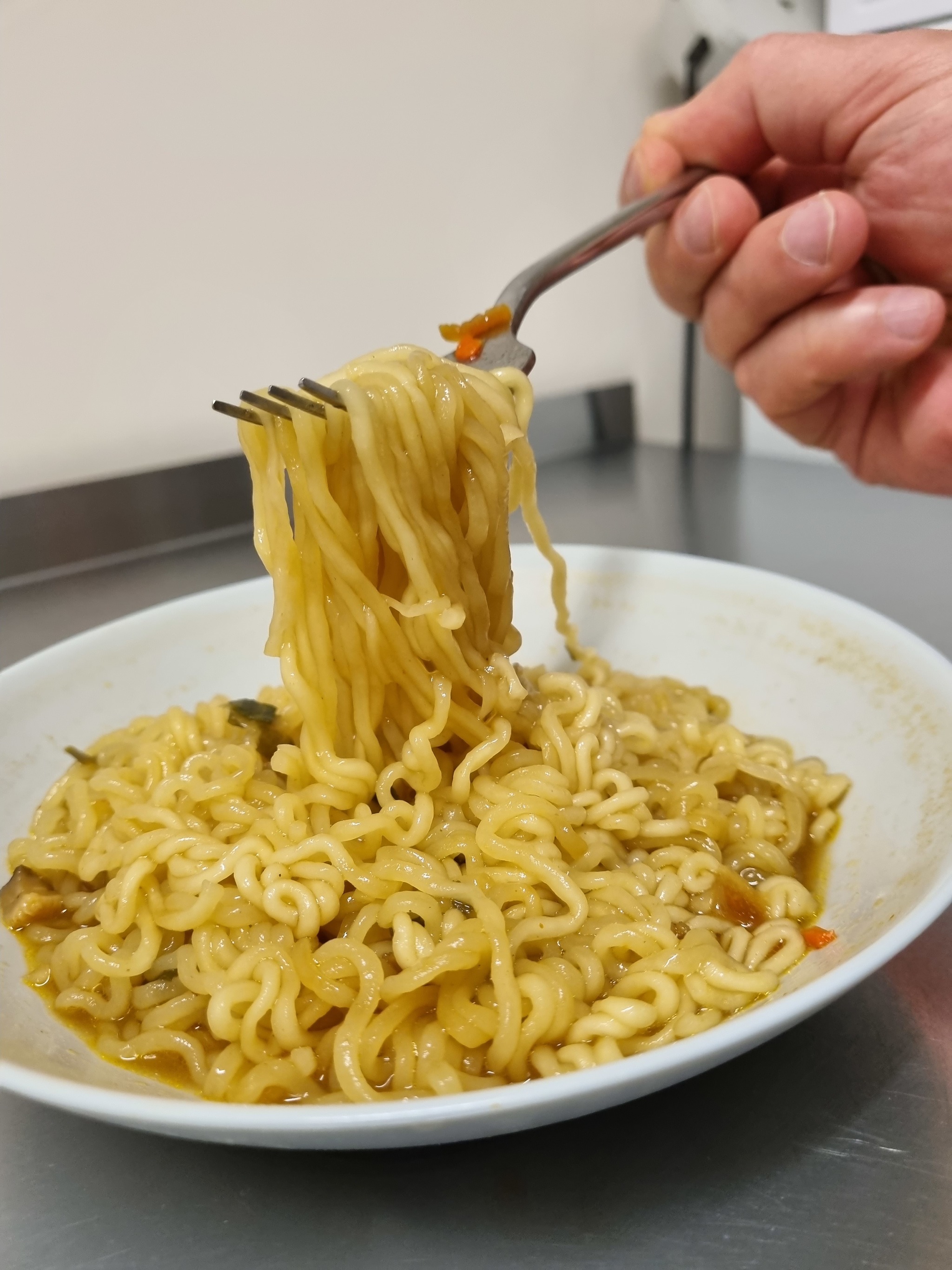 Очень вкусно! Лапша плотная, сильных ароматов в приправе нет. Судя по отсутствию дохлых красных куриц на упаковке, неострая, вероятно, подойдёт людям, не переносящим остроту. Даже с Каролиной не особо остро получилось.