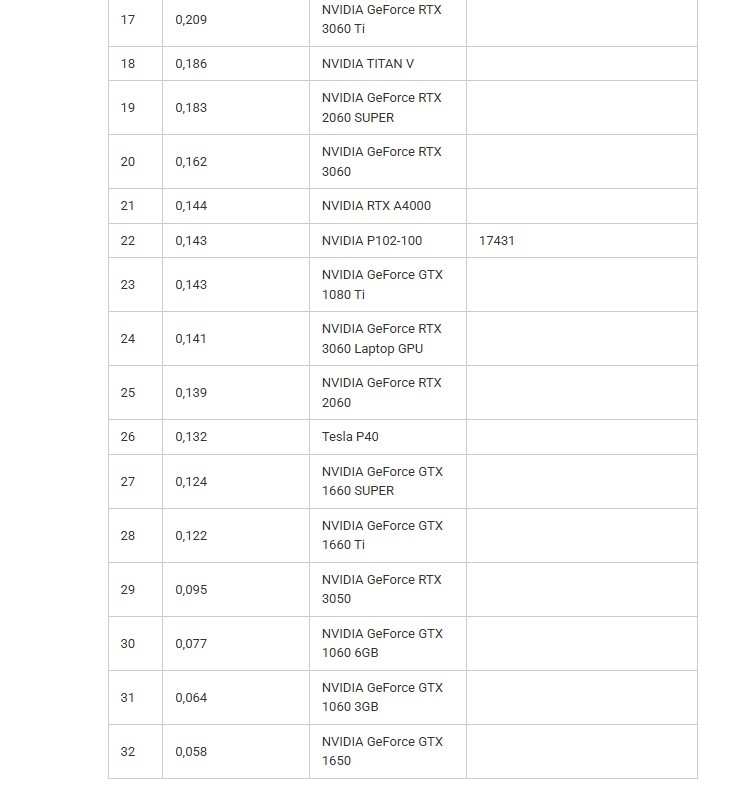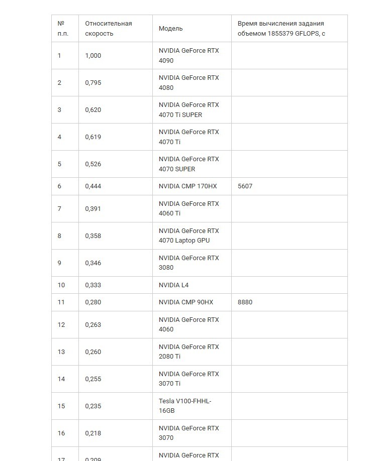 В рейтинге CMP 90HX заметно ниже NVIDIA GeForce RTX 3080, разница в 23% объясняется уменьшением лимита потребляемой мощности до 250 Вт, скорее всего при одинаковом лимите энергопотребления, время вычисления заданий тоже будет одинаковым.