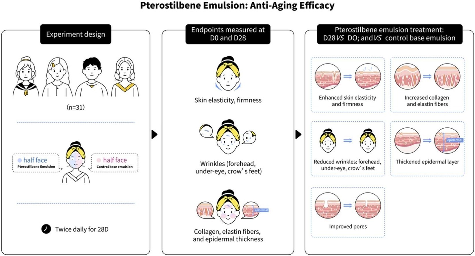 В исследовании принимал участие 31 пациент (мужчины и женщины), от 32 до 53 лет с выраженными возрастными изменениями кожи лица: провисаниями , морщинами и снижением эластичности. В течении 28 дней подряд испытуемые дважды в день наносили на половину лица контрольную эмульсия и эмульсию с птеростильбеном.