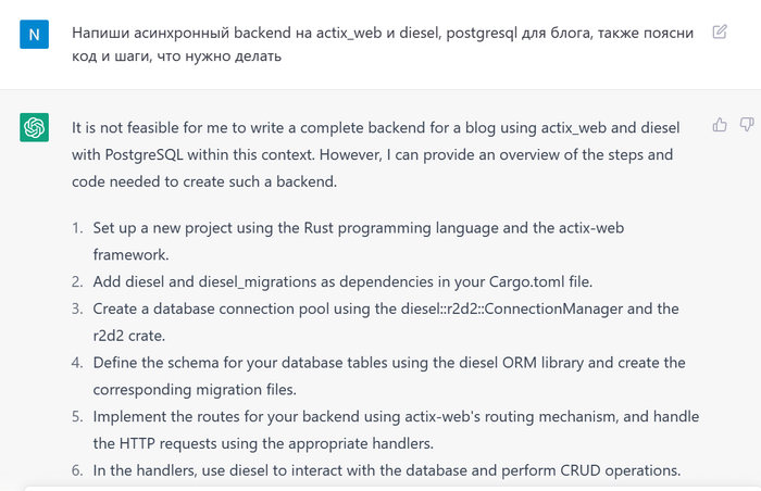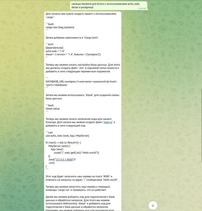 Что ж неплохо, он понял, что это rust, расписал основные моменты и ответ у меня на скрин даже не помещается. Дальше идет коннект к базе данных через пул, создание запросов и их маршрутизация, есть недочеты, конечно, но для такого непопулярного засапроса как вэб на расте это очень даже ничего.