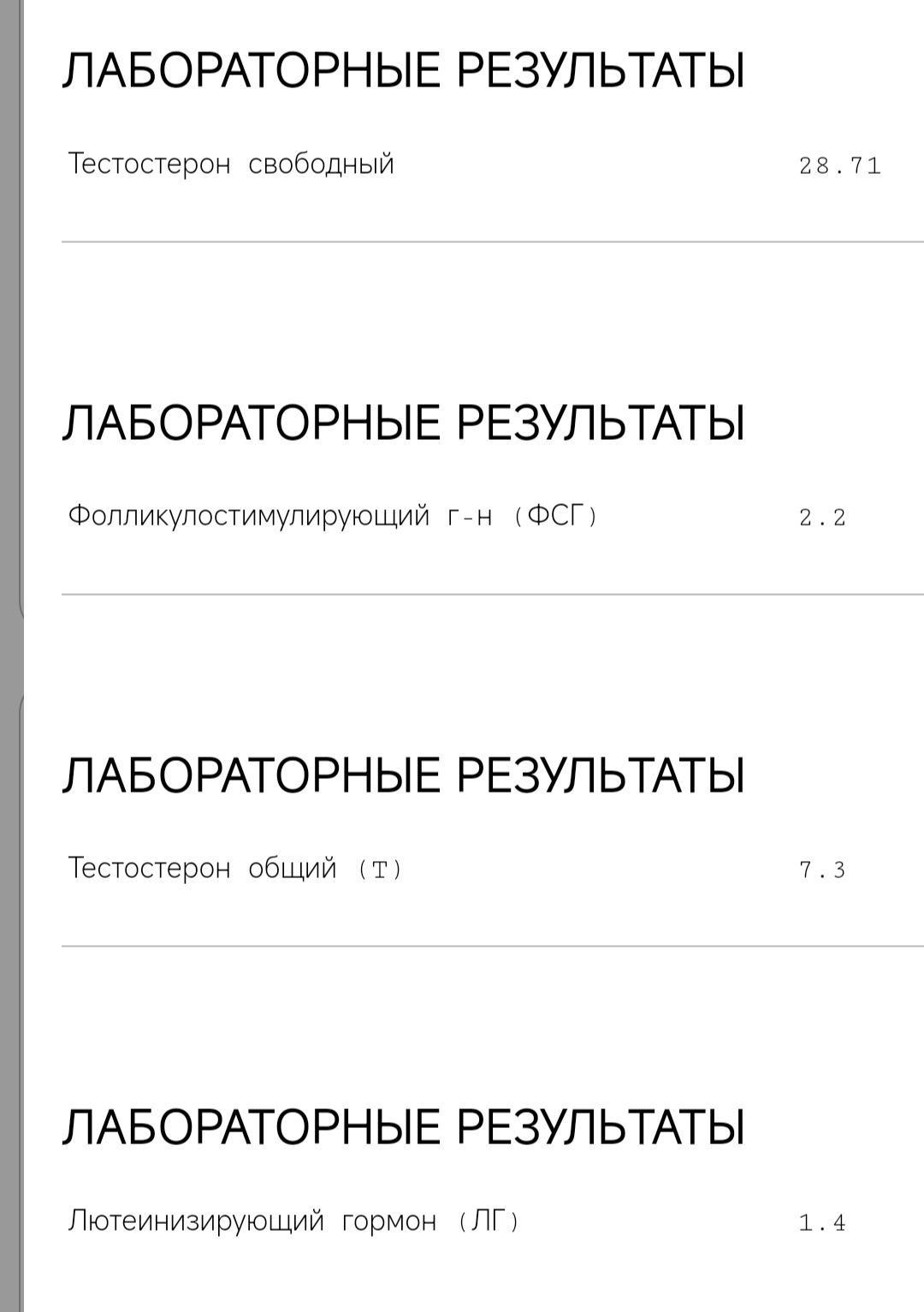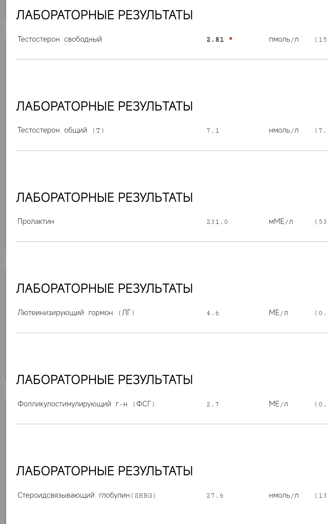 Это результаты анализов/через примерно каждый месяц. Тестостерон болтается в районе минимума.