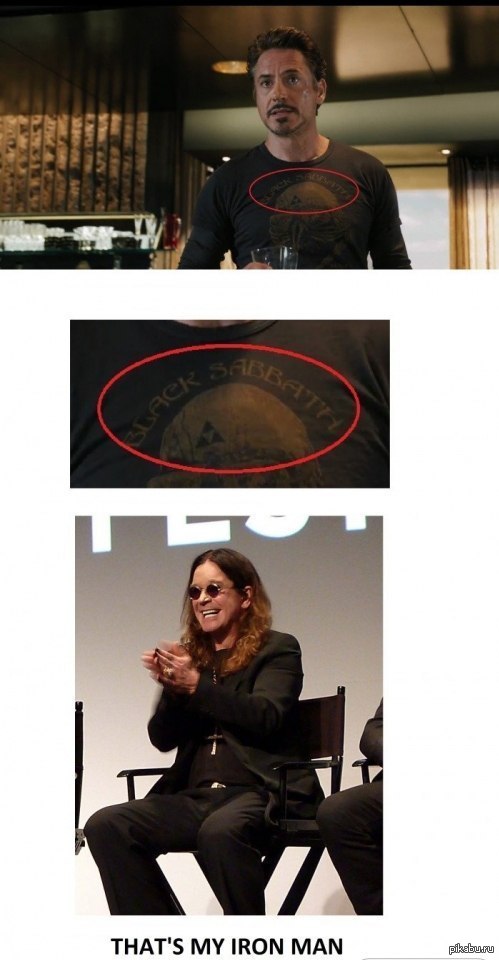 794 Ekzodar That's my "Iron Man" 13 лет назад Тони Старк носит футболку «Black Sabbath» (в которой, в своё время пел Оззи Осборн). Эта группа хорошо известна благодаря их песне «Iron Man». Интересное