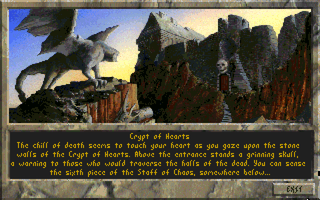 Отметки на свитке монахов говорили о месте под названием Крипта Сердец. Это был мрачный замок в горах на востоке провинции. Когда я увидел его каменные стены, то ощутил неприятное чувство, будто бы холодок смерти коснулся моего сердца. Над входом оскалился недоброй улыбкой огромный череп - предупреждение тем, кто решится войти в залы мёртвых.