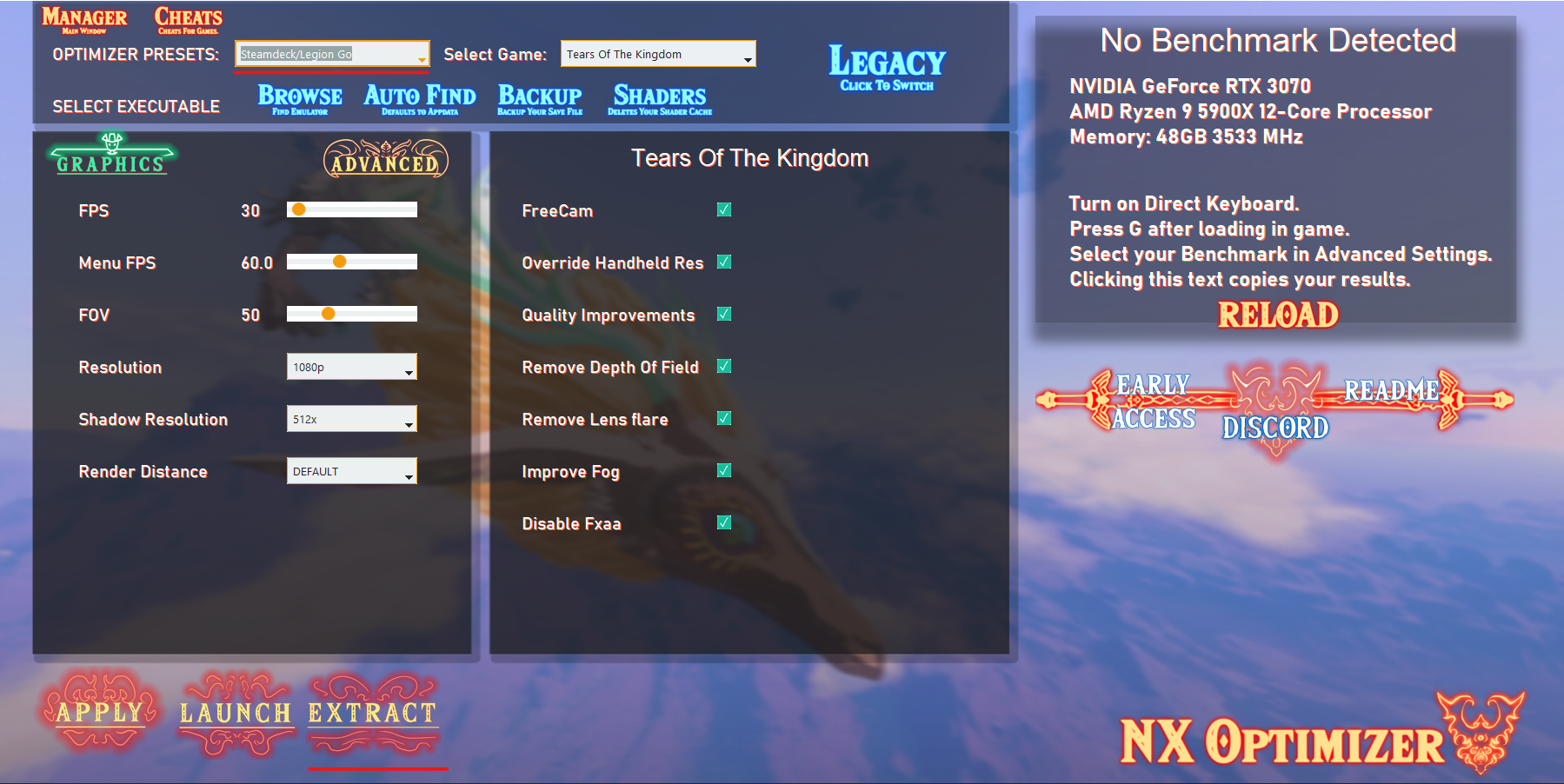 Необходимо выбрать набор настроек Steamdeck/Legion Go → Extract, закрываем оптимизатор.