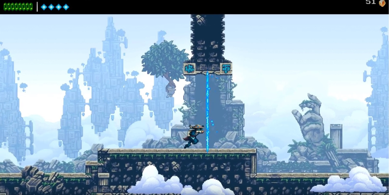 Однако проявляются и важные отличия. Так в The Messenger существует древо прокачки. Набора опыта и level-up в игре нет. Приёмы и новые элементы снаряжения, вроде крючьев, позволяющих взбираться на стены, покупаются за осколки времени в волшебной лавке. Попасть в лавку можно через порталы, разбросанные на пути (как правило 3 штуки на локацию: в начале, в середине и в конце уровня перед боссом). Порталы служат ещё и чекпоинтами, ведь по традициям старой школы, да, и вообще, жанра платформеров, права сохраняться в любом понравившемся месте, у игрока нет.