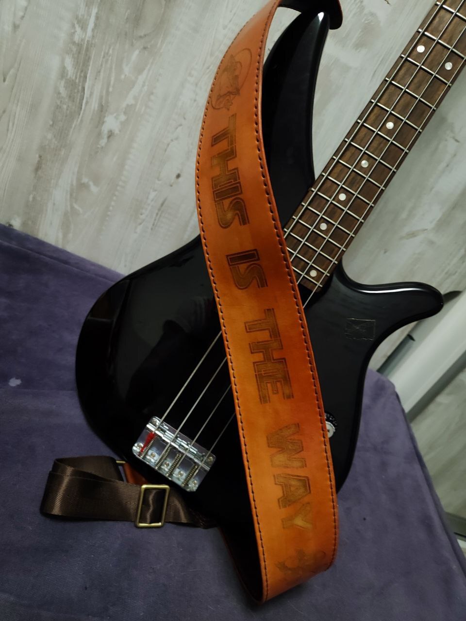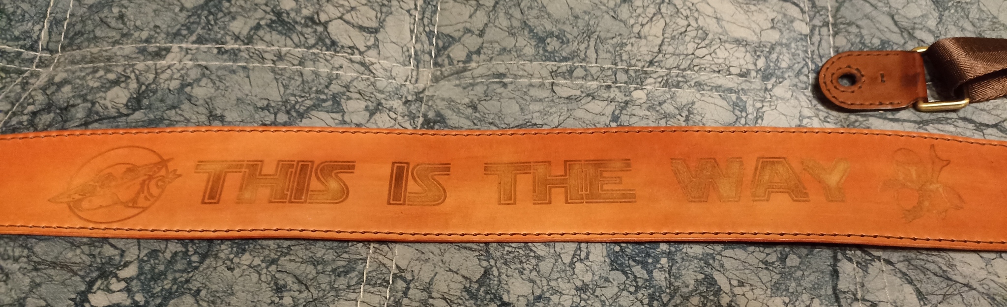 Двухсторонний ремень на гитару. Сделан на заказ для пикабушницы. На фото к сожалению очень сложно передать гравировку.