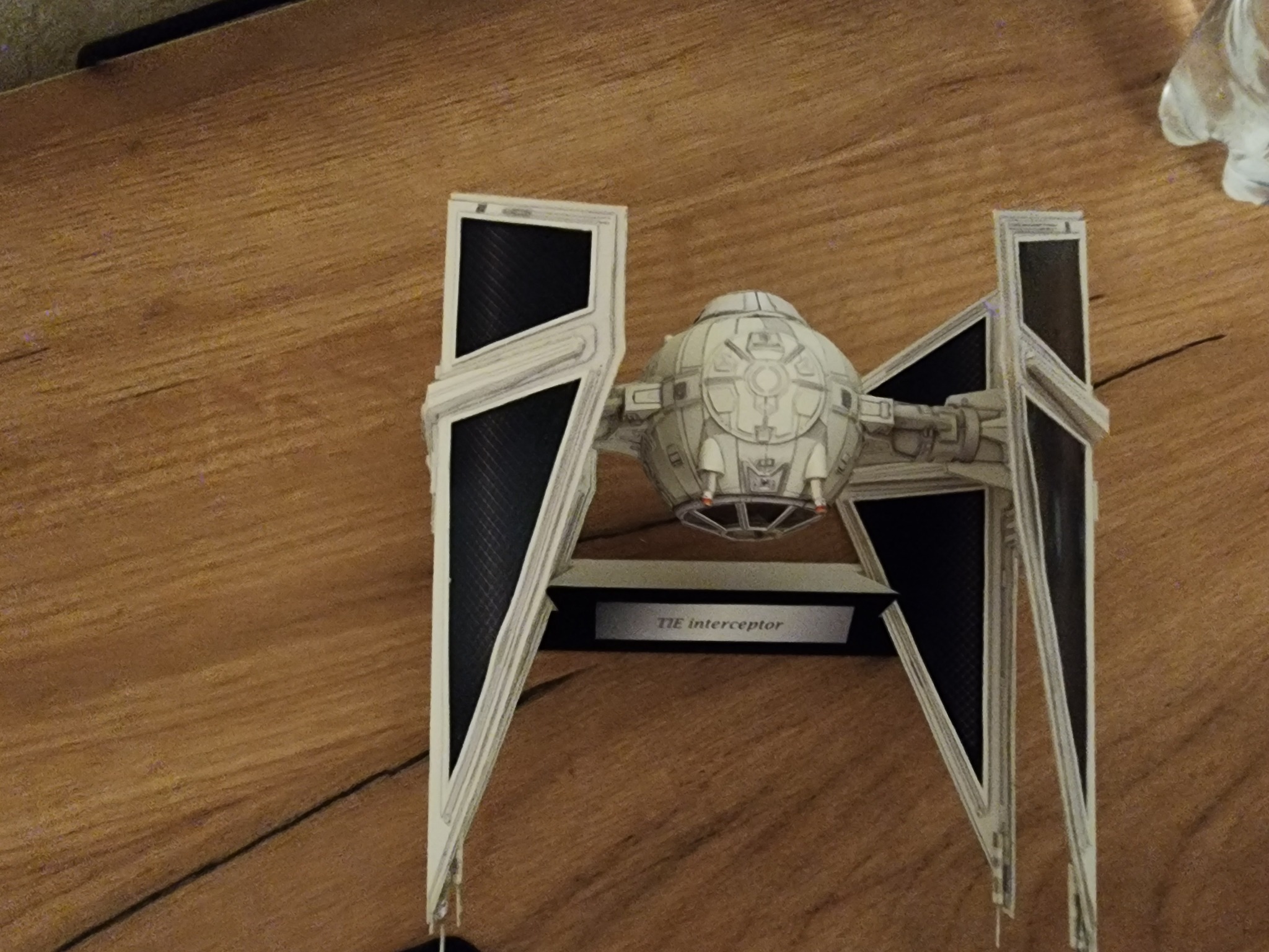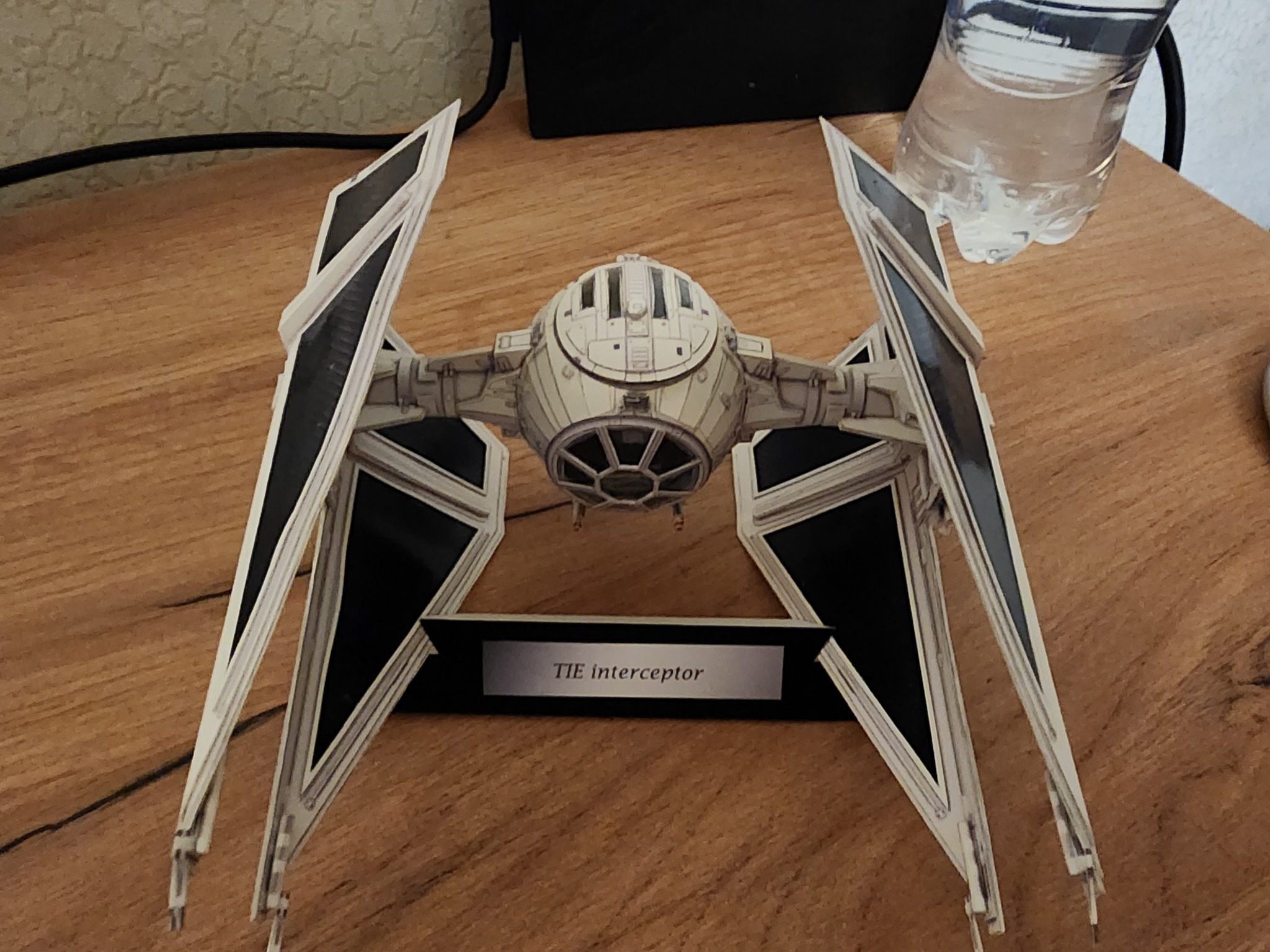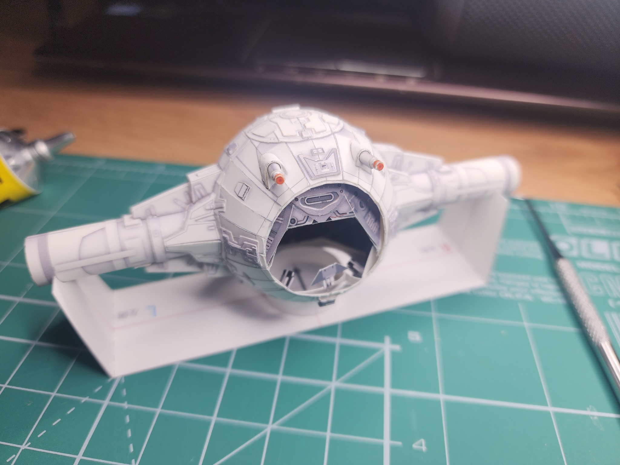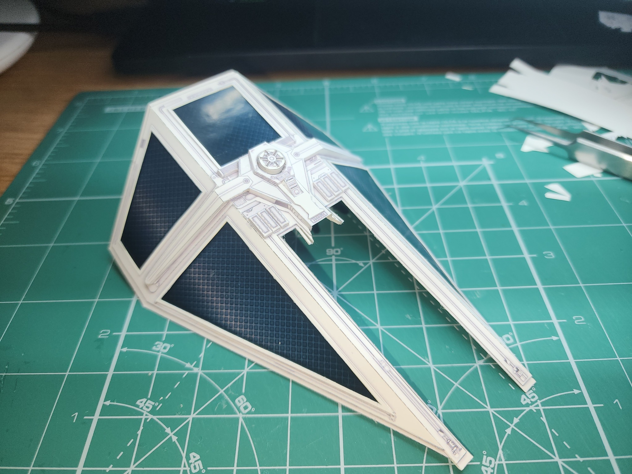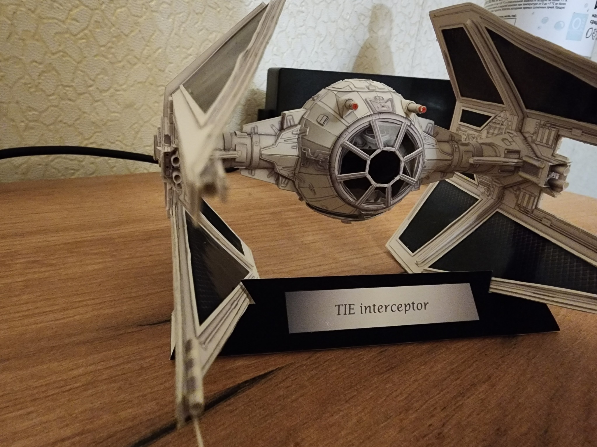 В начале года расчехлил всё-таки свои ножи и пинцеты и решил вернуться к моему любимому японцу UHU02. Выбора пал на модель TIE Interceptor. Процесс сборки занял почти полгода по выходным с перерывом на летние покатушки на велике и семью. Процесс изготовления проще, чем другие его модели, несмотря на множество мелких деталей, но всё равно довольно интересный. Запустить строительство смог только с третьего раза. Сначала ошибся с выбором толщины бумаги. Выбрал слишком толстую из-за чего не смог ровно склеить шарик корпуса. Во второй раз просто неверно вставил кокпит в корпус. потратив обучение себя путём совершения ошибок почти два месяца, с третьего раза процесс удачно пошёл. В этот раз без лака.