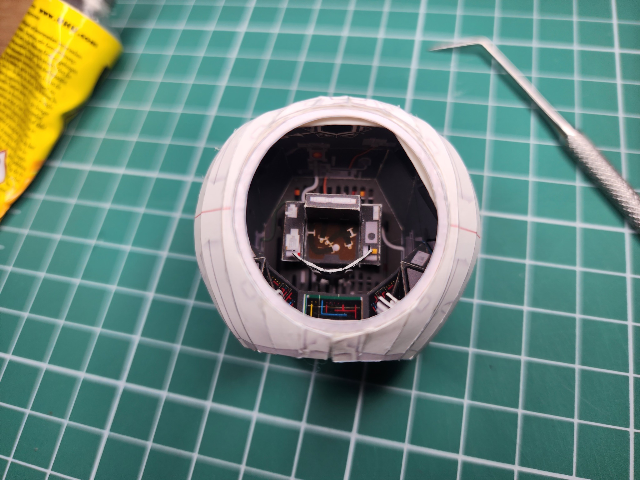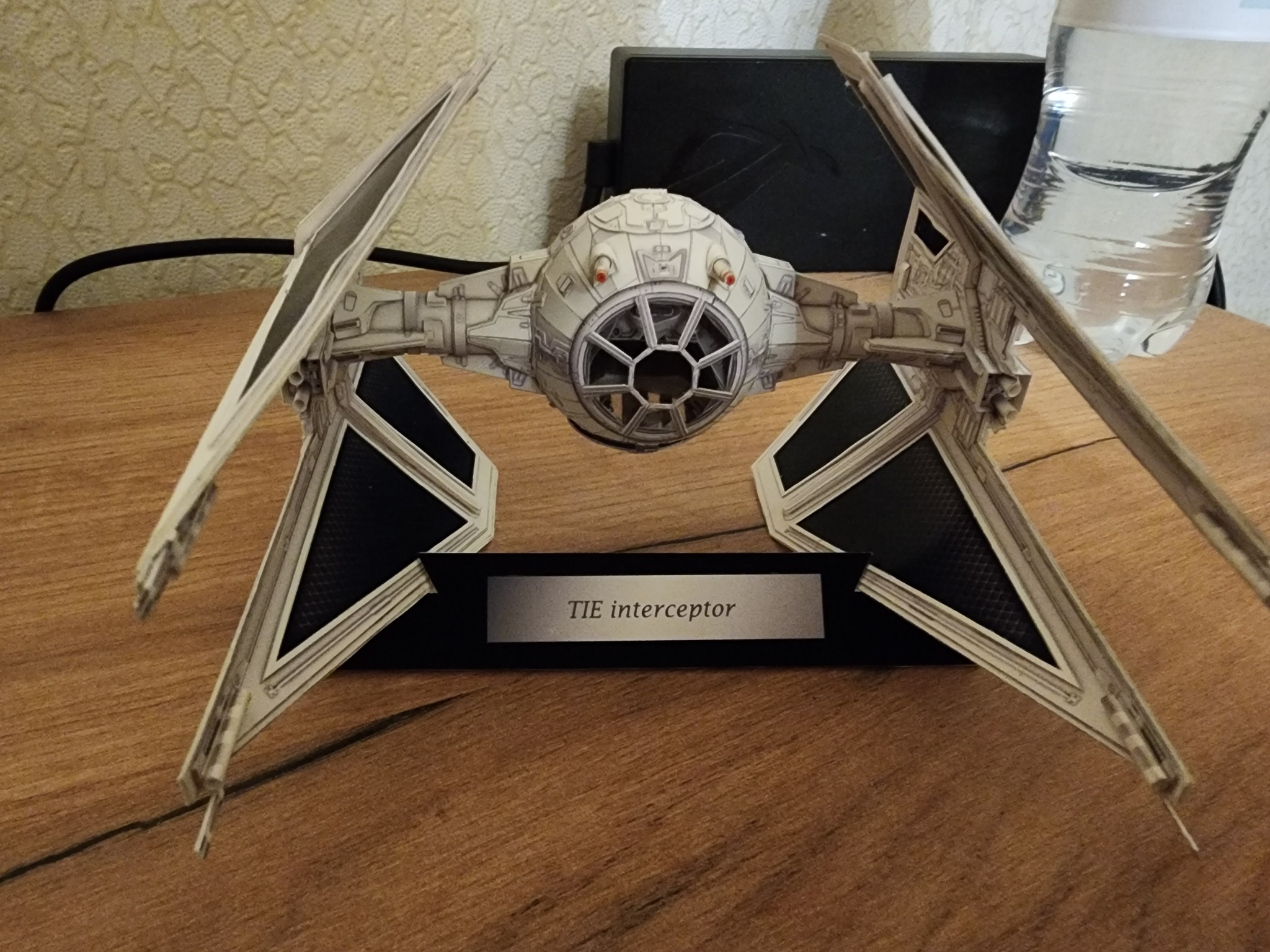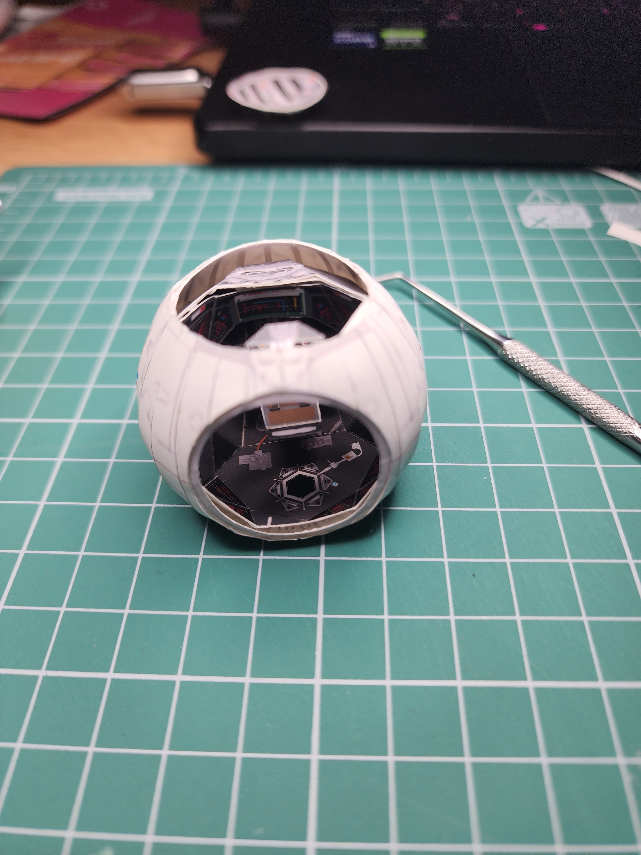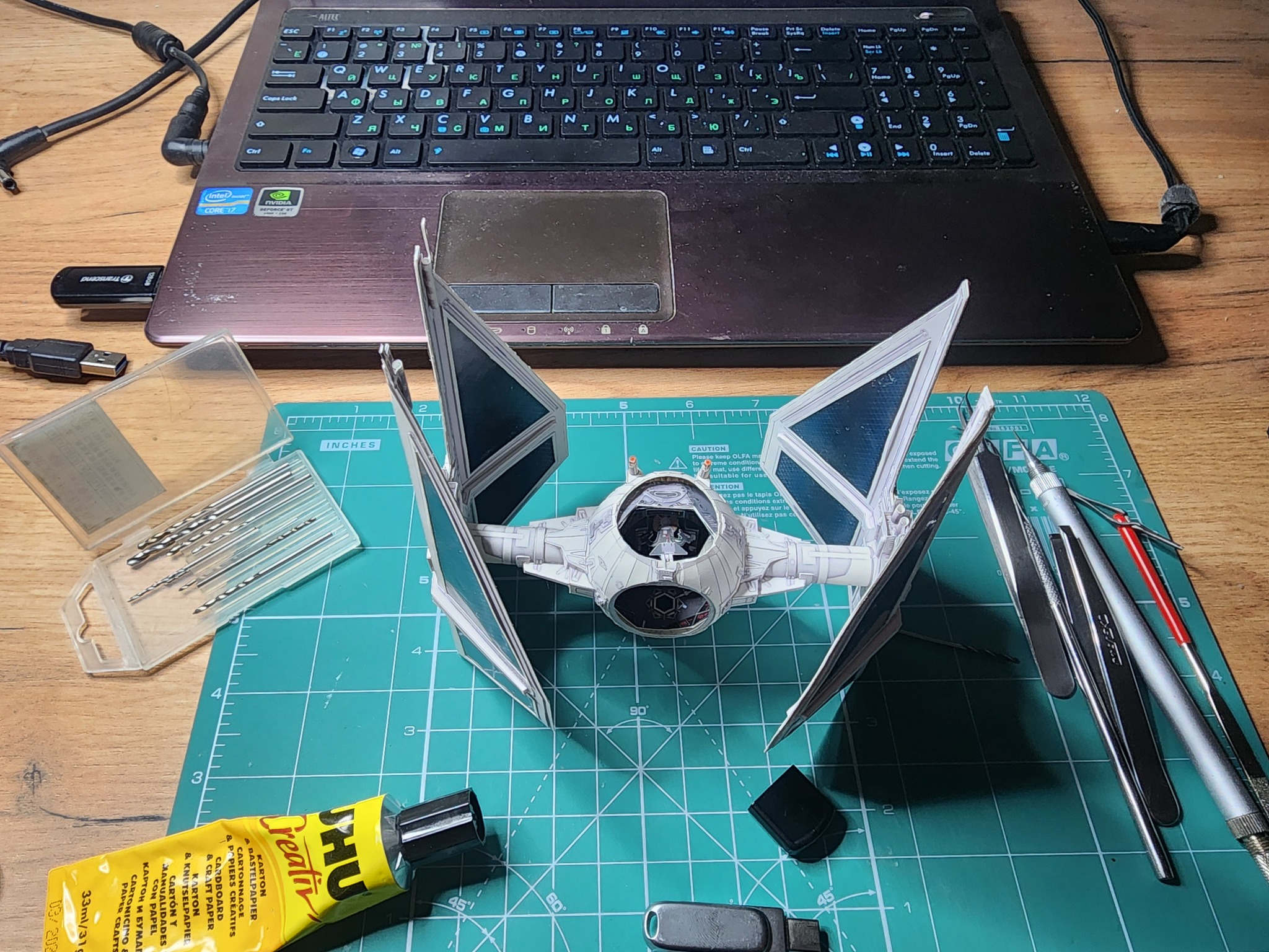 В начале года расчехлил всё-таки свои ножи и пинцеты и решил вернуться к моему любимому японцу UHU02. Выбора пал на модель TIE Interceptor. Процесс сборки занял почти полгода по выходным с перерывом на летние покатушки на велике и семью. Процесс изготовления проще, чем другие его модели, несмотря на множество мелких деталей, но всё равно довольно интересный. Запустить строительство смог только с третьего раза. Сначала ошибся с выбором толщины бумаги. Выбрал слишком толстую из-за чего не смог ровно склеить шарик корпуса. Во второй раз просто неверно вставил кокпит в корпус. потратив обучение себя путём совершения ошибок почти два месяца, с третьего раза процесс удачно пошёл. В этот раз без лака.