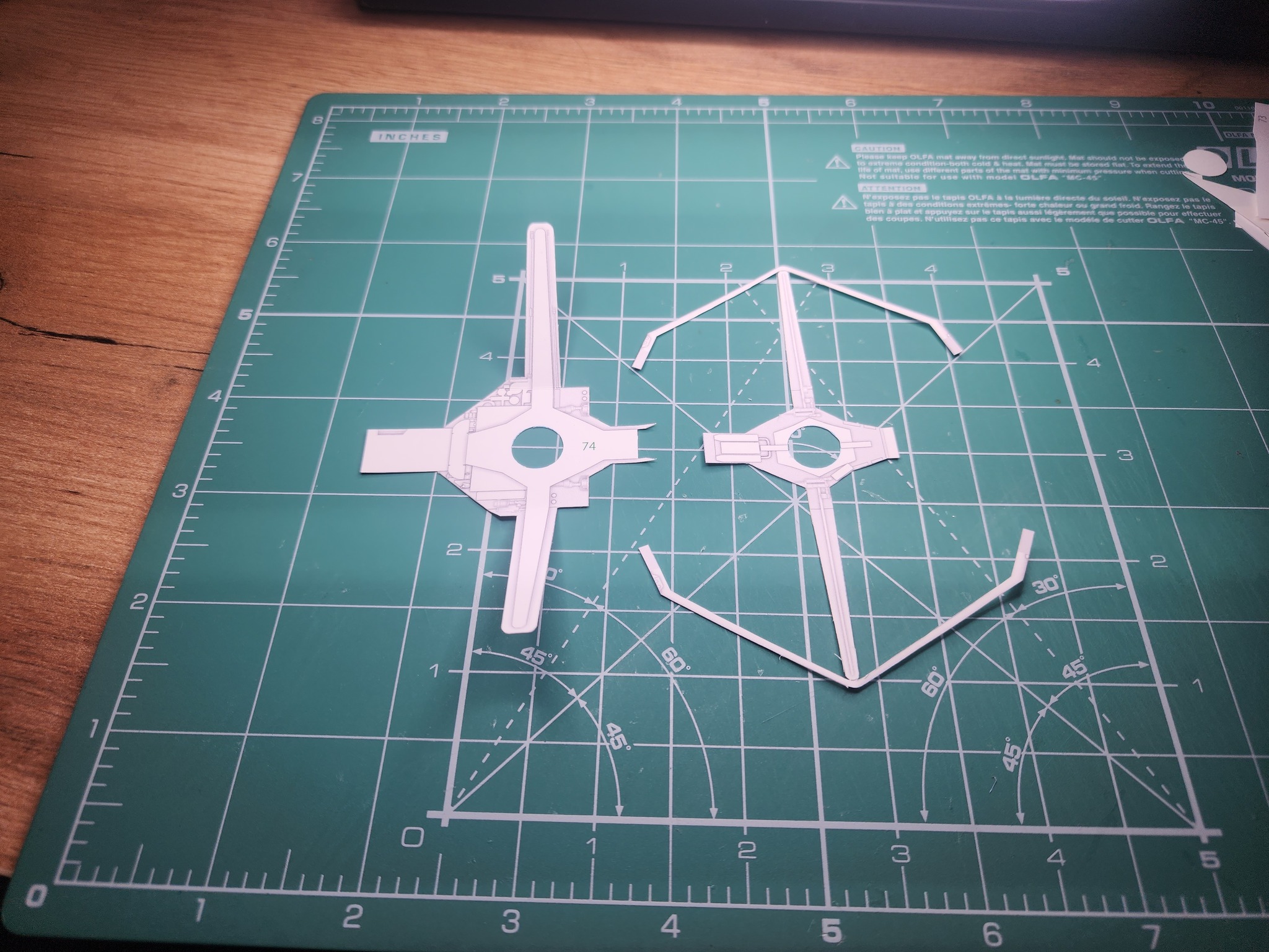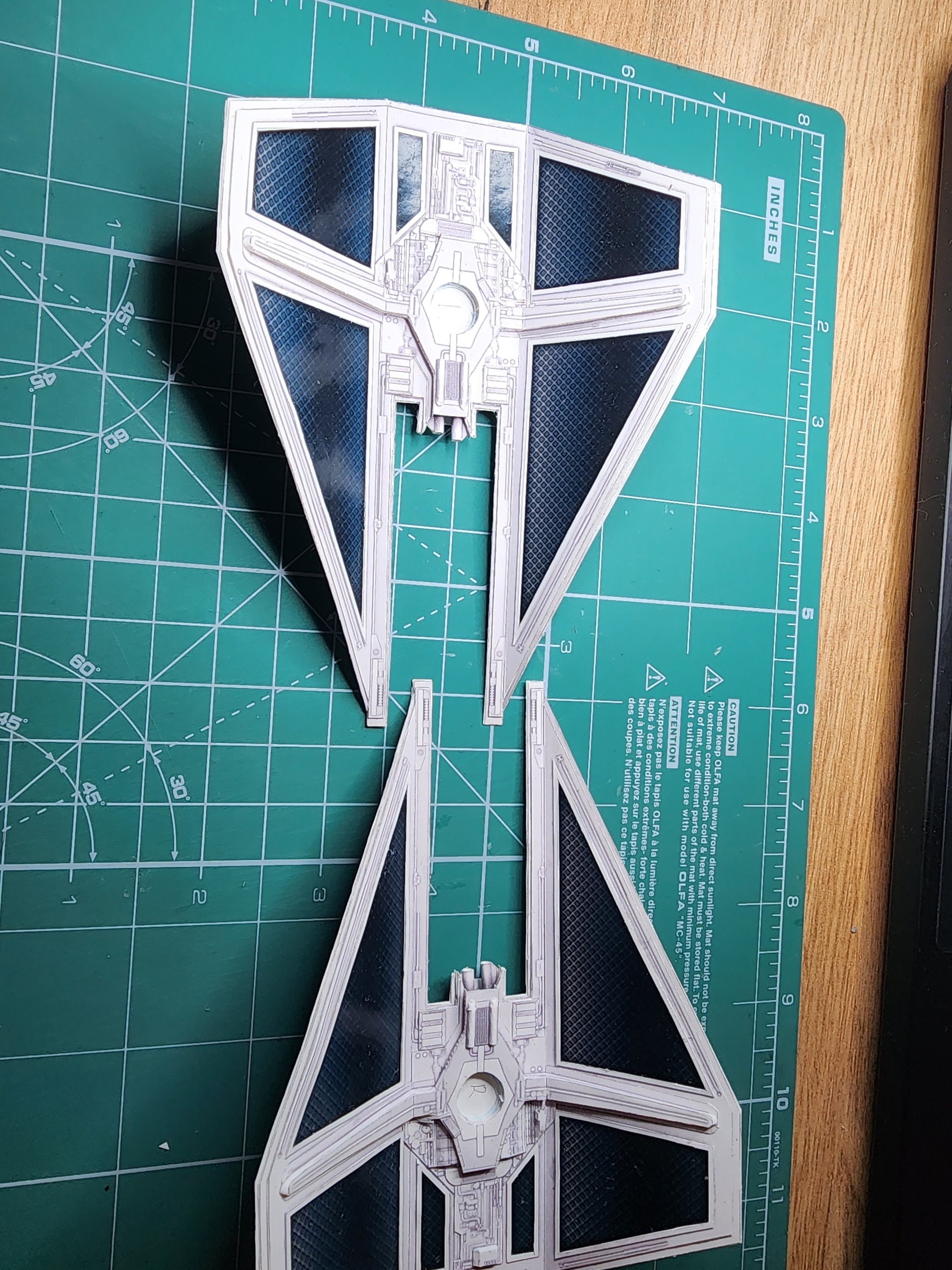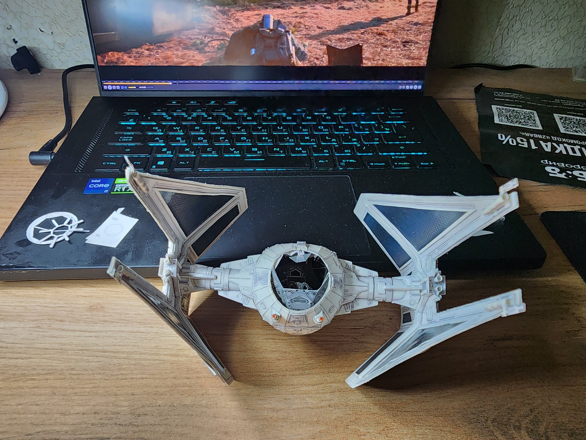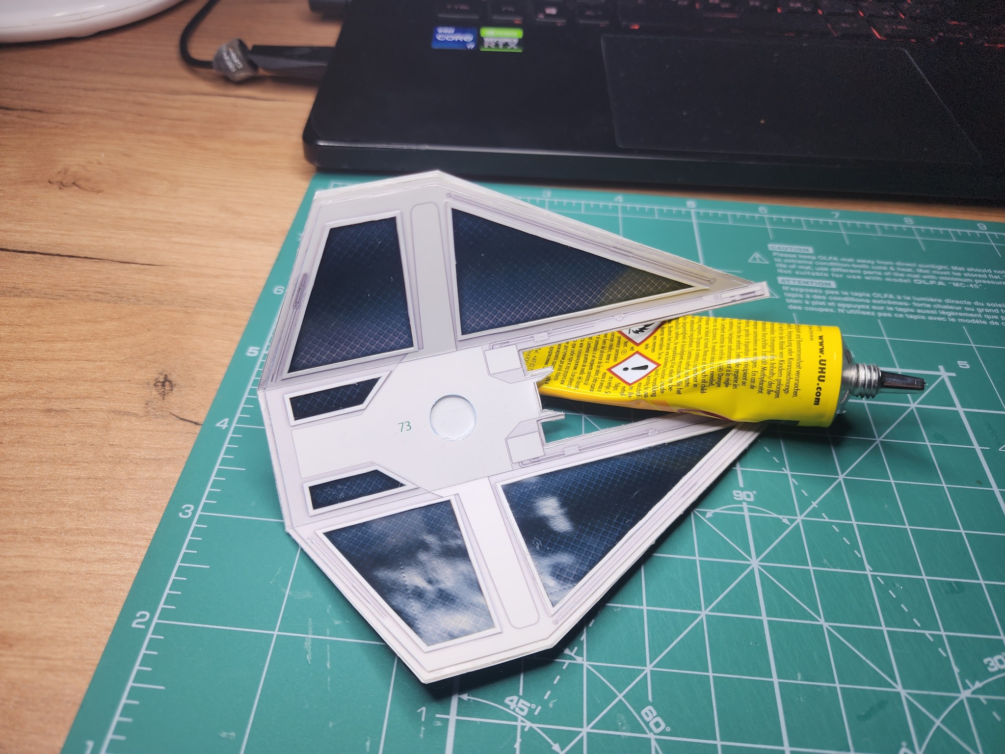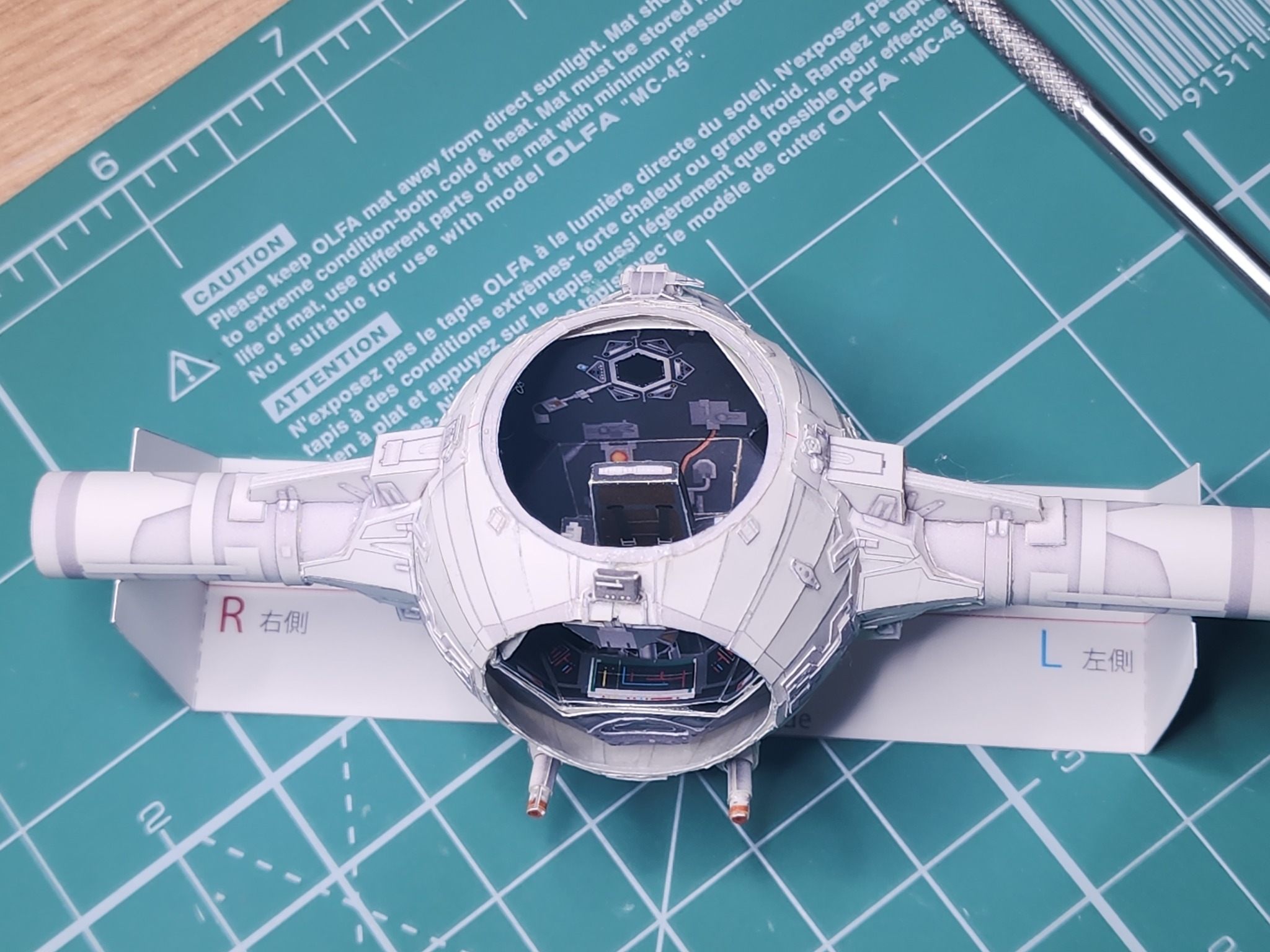 В начале года расчехлил всё-таки свои ножи и пинцеты и решил вернуться к моему любимому японцу UHU02. Выбора пал на модель TIE Interceptor. Процесс сборки занял почти полгода по выходным с перерывом на летние покатушки на велике и семью. Процесс изготовления проще, чем другие его модели, несмотря на множество мелких деталей, но всё равно довольно интересный. Запустить строительство смог только с третьего раза. Сначала ошибся с выбором толщины бумаги. Выбрал слишком толстую из-за чего не смог ровно склеить шарик корпуса. Во второй раз просто неверно вставил кокпит в корпус. потратив обучение себя путём совершения ошибок почти два месяца, с третьего раза процесс удачно пошёл. В этот раз без лака.