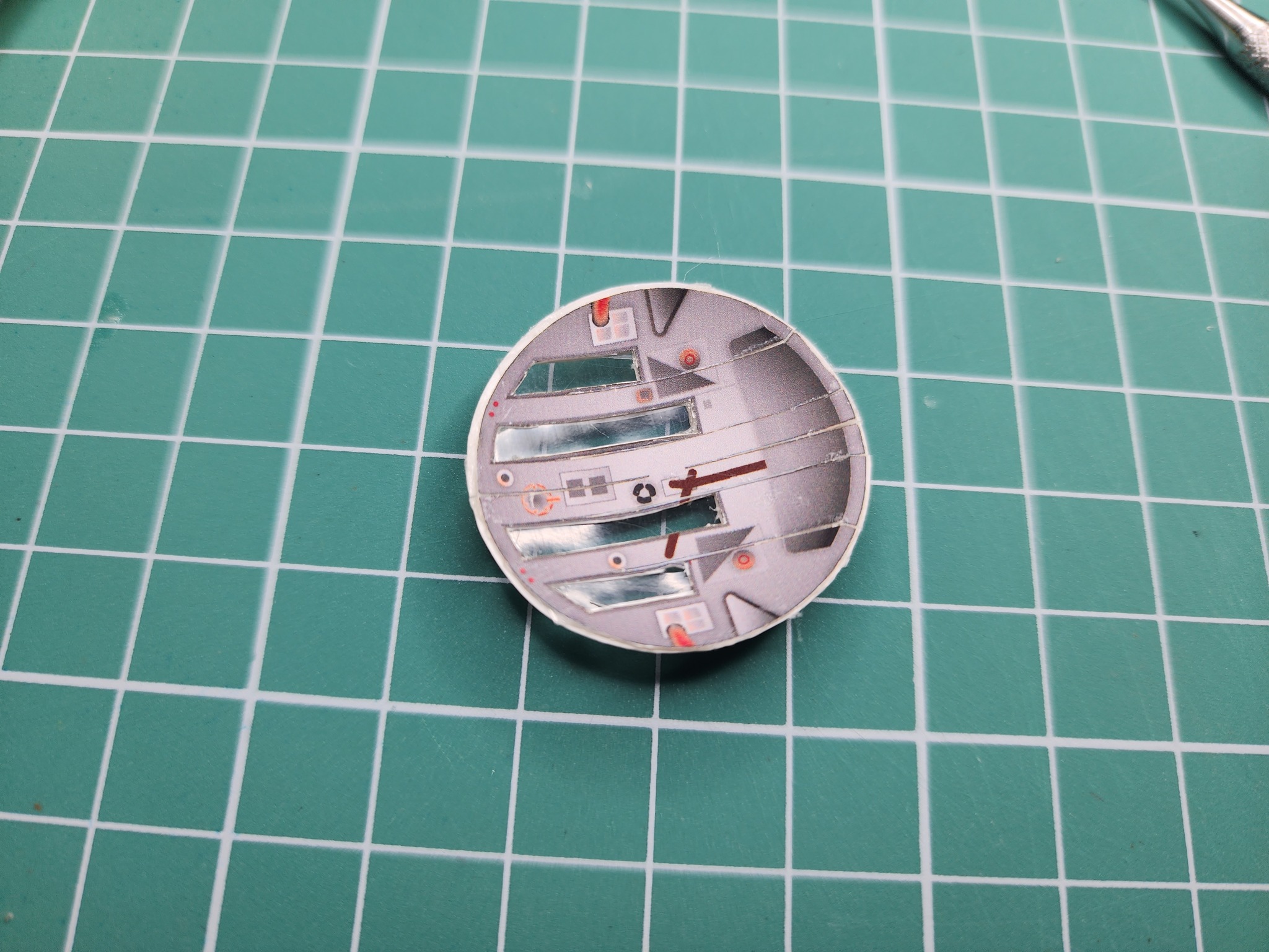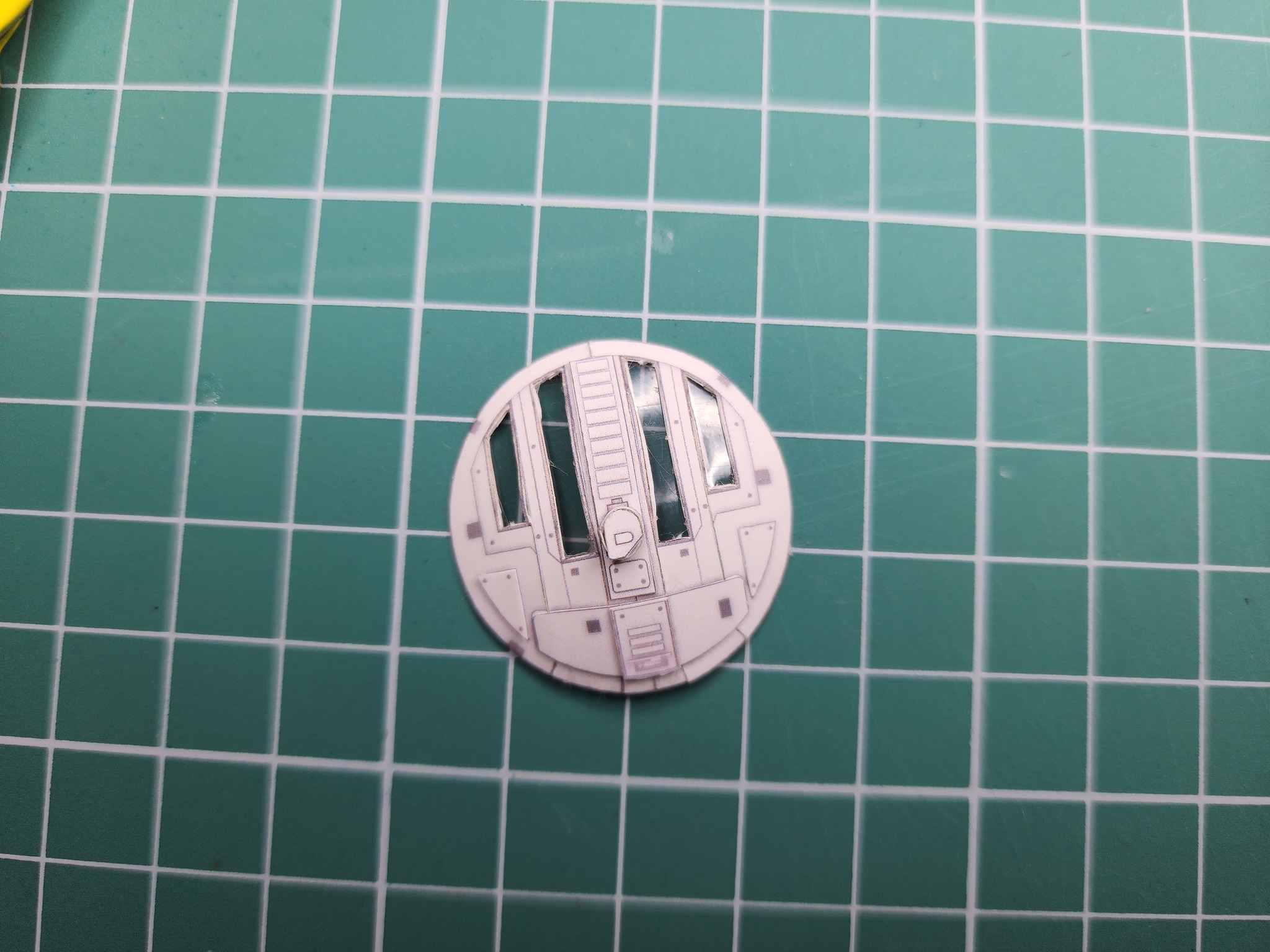 Тут собран люк. Немного возьни с приклеиванием прозрачной плёнки к бумаге. Люк свободно вставляется в корпус и на готовой модели его можно открыть.