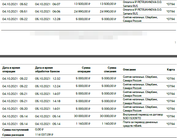 Дальше больше, я начинаю пытаться выяснить информацию. И оказывается, что в 5утра 14 минут в Самаре обналичивают с банкоматов деньги и покупают в каких то скупках товары. Все это по выписке из банка происходит в течении 15-20 минут. Но есть странный нюанс, на мой номер не приходят смс и я не знаю об операциях. А между тем, неизвестные при получении кредита электронно перекидывают на дебетовую карту некую сумму с кредитной и одновременно в Самаре в разных частях снимают. Банк, не блокирует подозрительные операции. Таким образом в Самаре уводят 100 тысяч. Которые теперь через три месяца банк почему-то на мой номер позвонил и сказал что я должна оплатить.