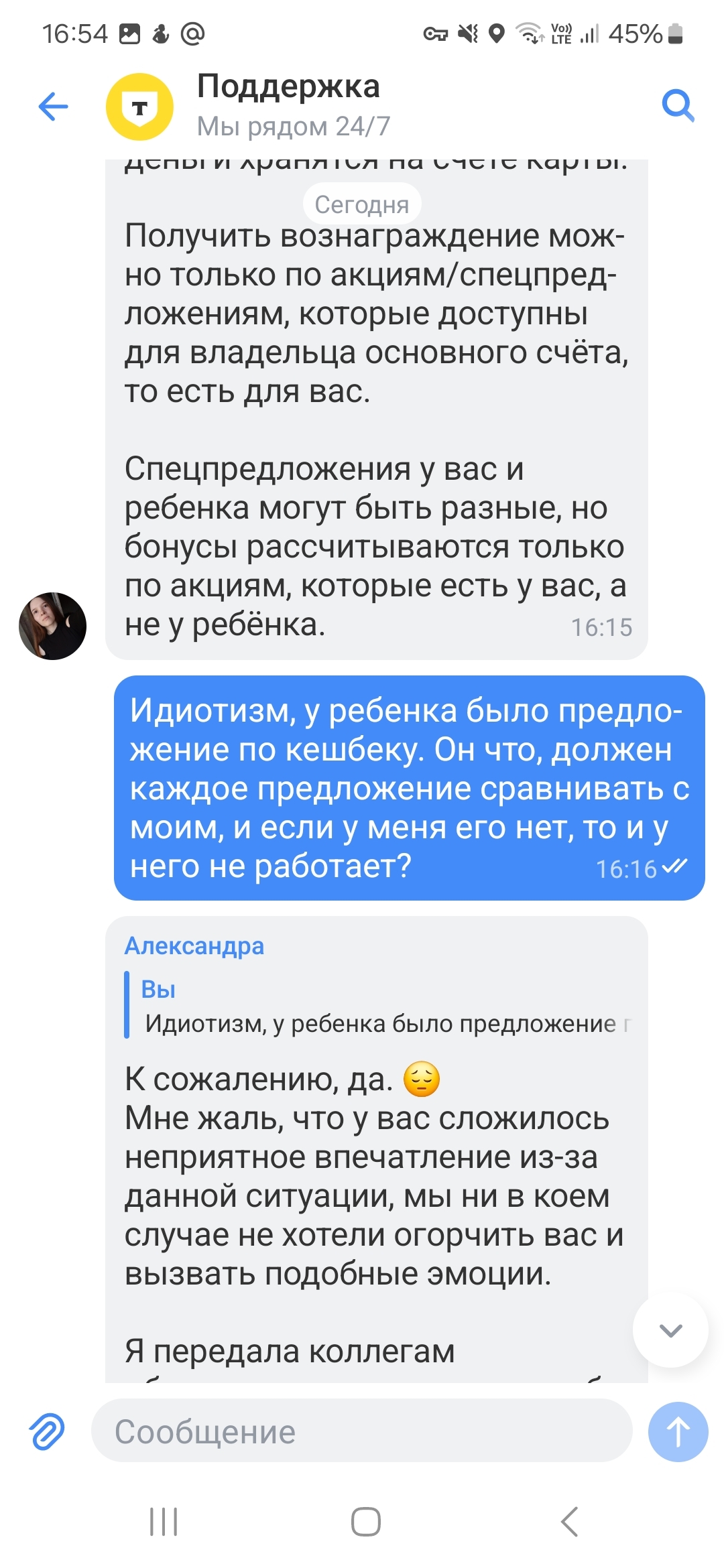 У дочки есть детская карта Тинькофф (Т-банк). Неделю назад у неё появилось предложение 100% кешбека на мороженое, она купила его в магазине и загрузила в приложении банка чек. Но в дату начисления кешбек не начислили, а поддержка отказывается начислять кешбек в связи с тем, что у родителя, к счету которого привязана детская карта, этого предложения не было. Скриншоты переписки с поддержкой: