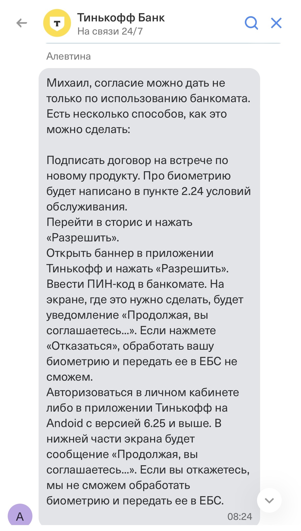 6 CoolMedengineer Тинькофф скрыто собирает данные о биометрии 1 год назад Может и не новость, но сегодня прилетело сообщение в госуслугах, что тинькофф зарегистрировал мою биометрию, решил спросить в банке, как так вышло? И вот ответ, то есть входя в приложение вы даете автоматом согласие на сбор биометрии. Т-Банк Мошенничество Скриншот 1 Ещё 0