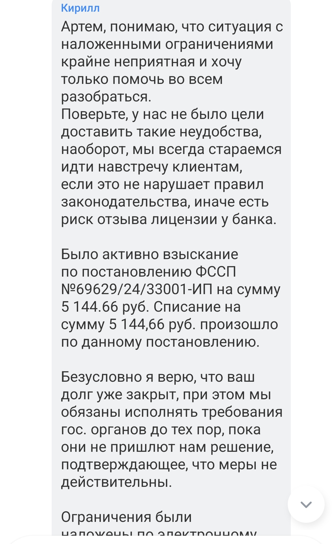 Я уже давно не пользуюсь данной шарашкой. Карту правда не закрыл, и приложение у меня их установлено, там в нем автостраховка. И было у меня ИП от приставов на сумму 5144,66₽, сумма небольшая, поэтому как пришло уведомление на госуслугах, то я и оплатил. Естественно везде все запреты сняли, во все банки, чьи карты у меня имеются пристав разослала уведомления, что я оплатил. И только на Тинькофф не сняли. Я в том году списывался с поддержкой, чтоб сняли. Они такие, типа да-да, снимем. Ну и хуй забили. А сегодня человек мне по ошибке перевёл долг ( а я рассчитывал на всю сумму. Хоть это 5144₽, но эти деньги) на Тинькоффскую карту. И у меня из переведённой суммы списывают 5144.
