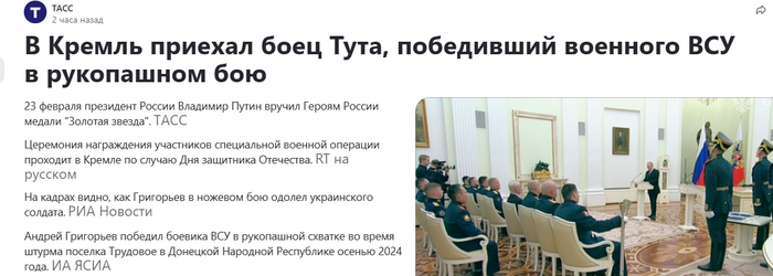 Аноним Типа "девочки - дизайнеры ошиблись?" 10 месяцев назад Ну просто о визите нашего Героя России Андрея Григорьева дзен или СМИ им транслируемые предоставили так,скриншот мой: Если чего , "Тута" - позывной нациста, в бою с которым Григорьев победил... Fake News Политика Фейк Владимир Путин Ещё 0