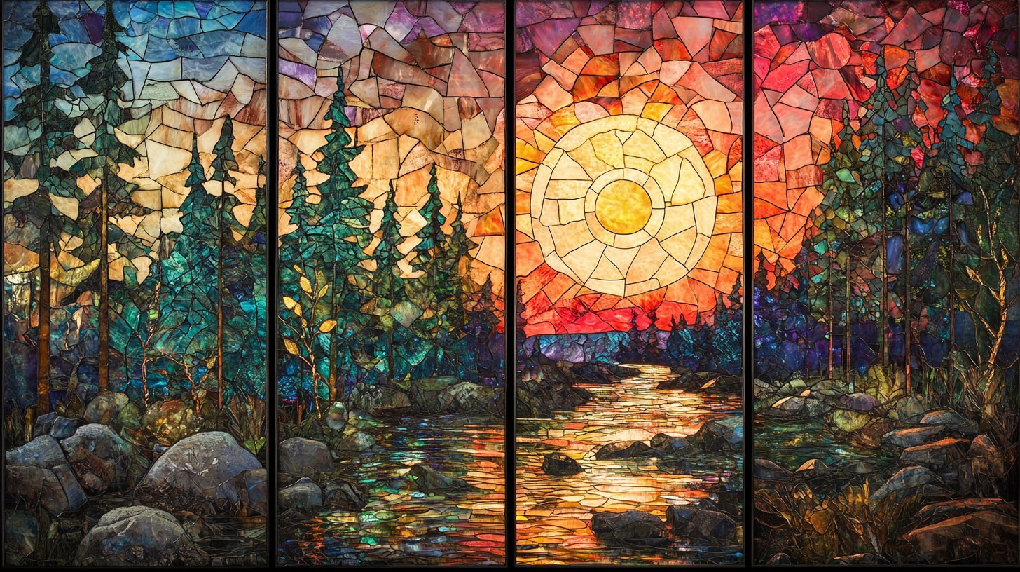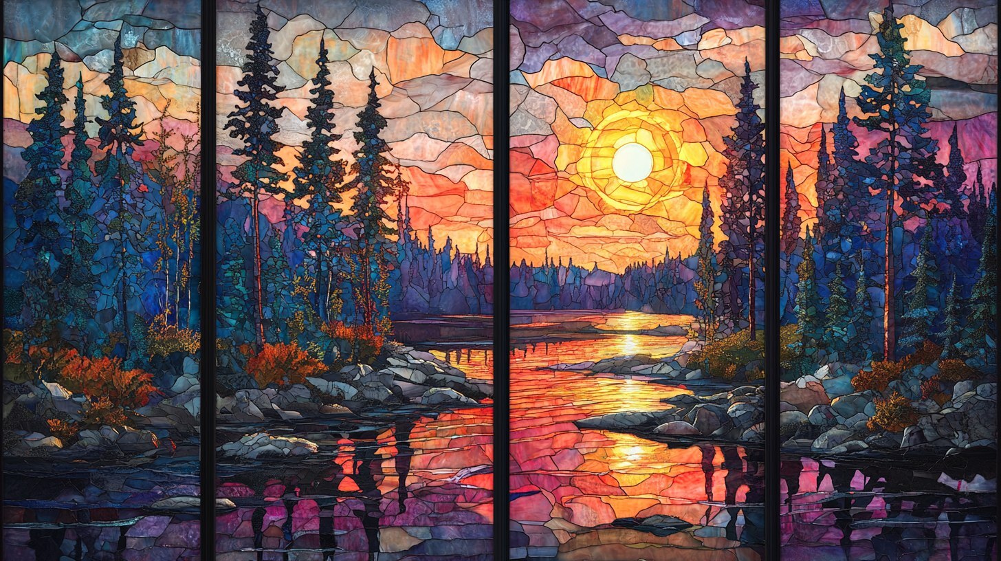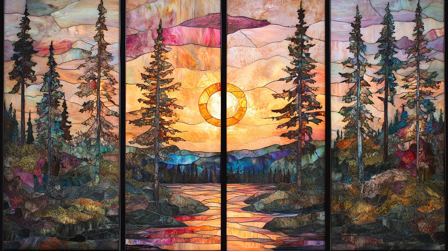 А солнце не должно быть по центру потому, что витраж из 4 частей и картинку надо разделить на 4 куска, чтобы в итоге это смотрелось как одна картина. Ну и , чтобы солнце не попало на перекладину.