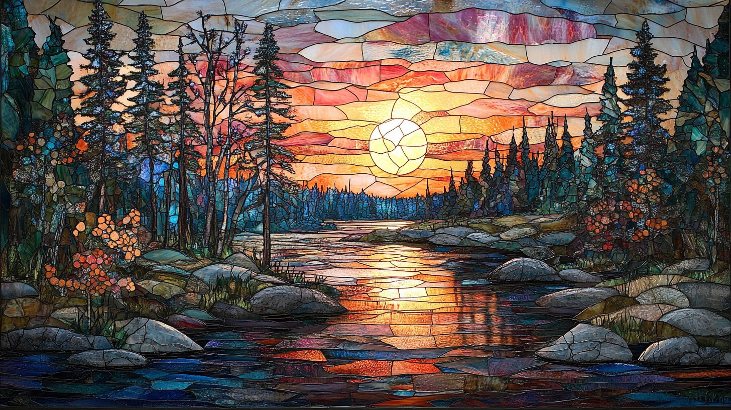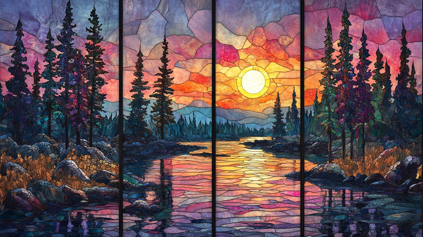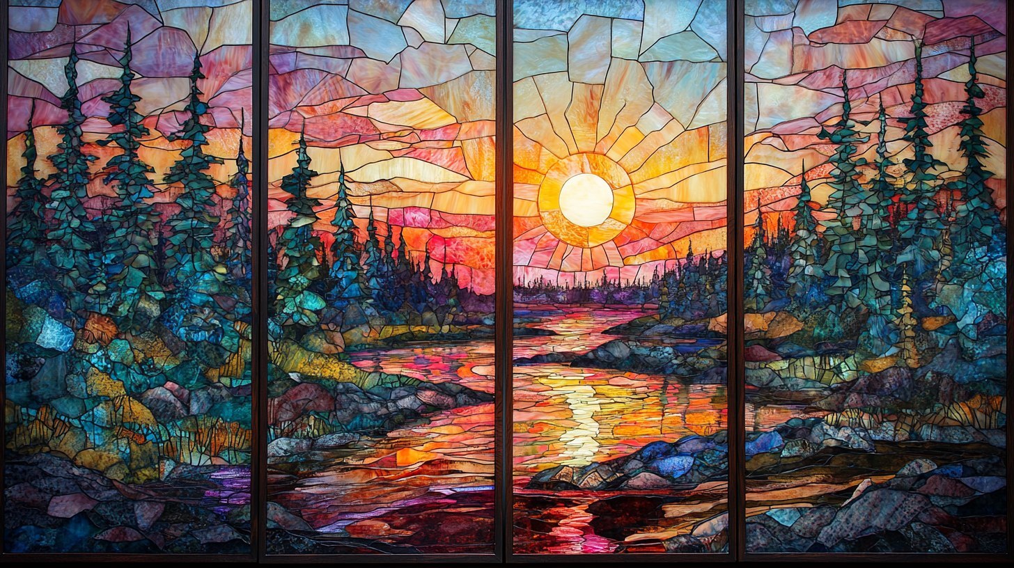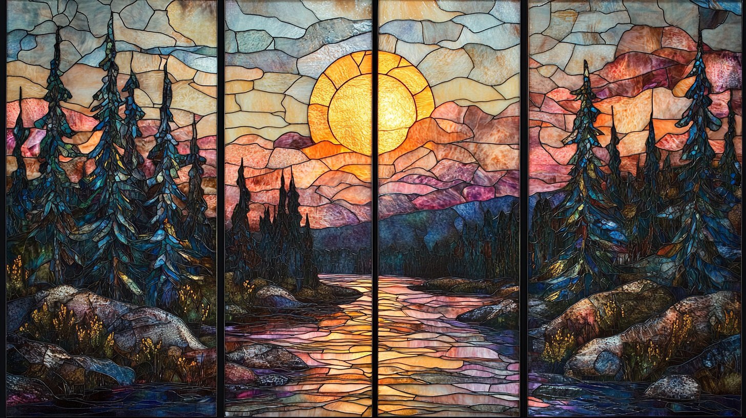 А солнце не должно быть по центру потому, что витраж из 4 частей и картинку надо разделить на 4 куска, чтобы в итоге это смотрелось как одна картина. Ну и , чтобы солнце не попало на перекладину.