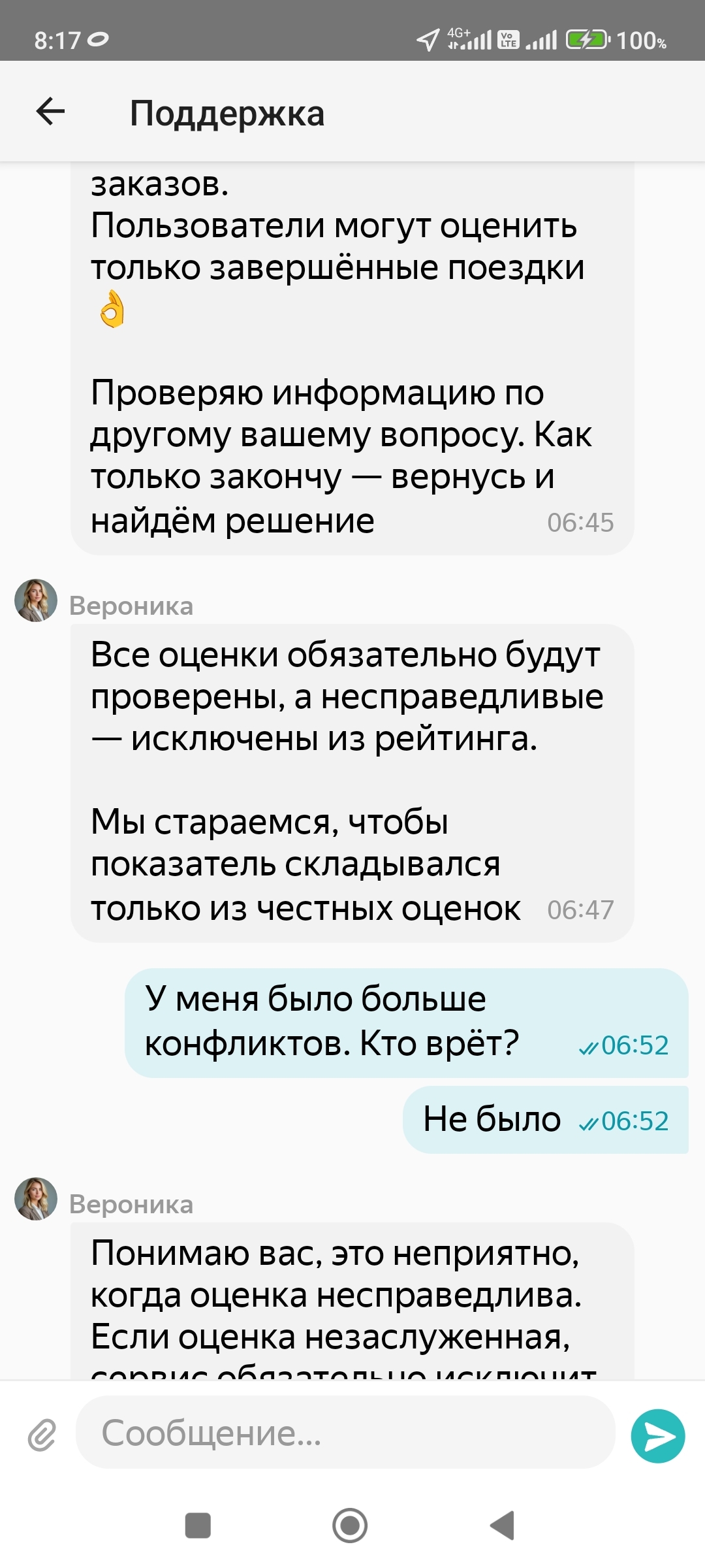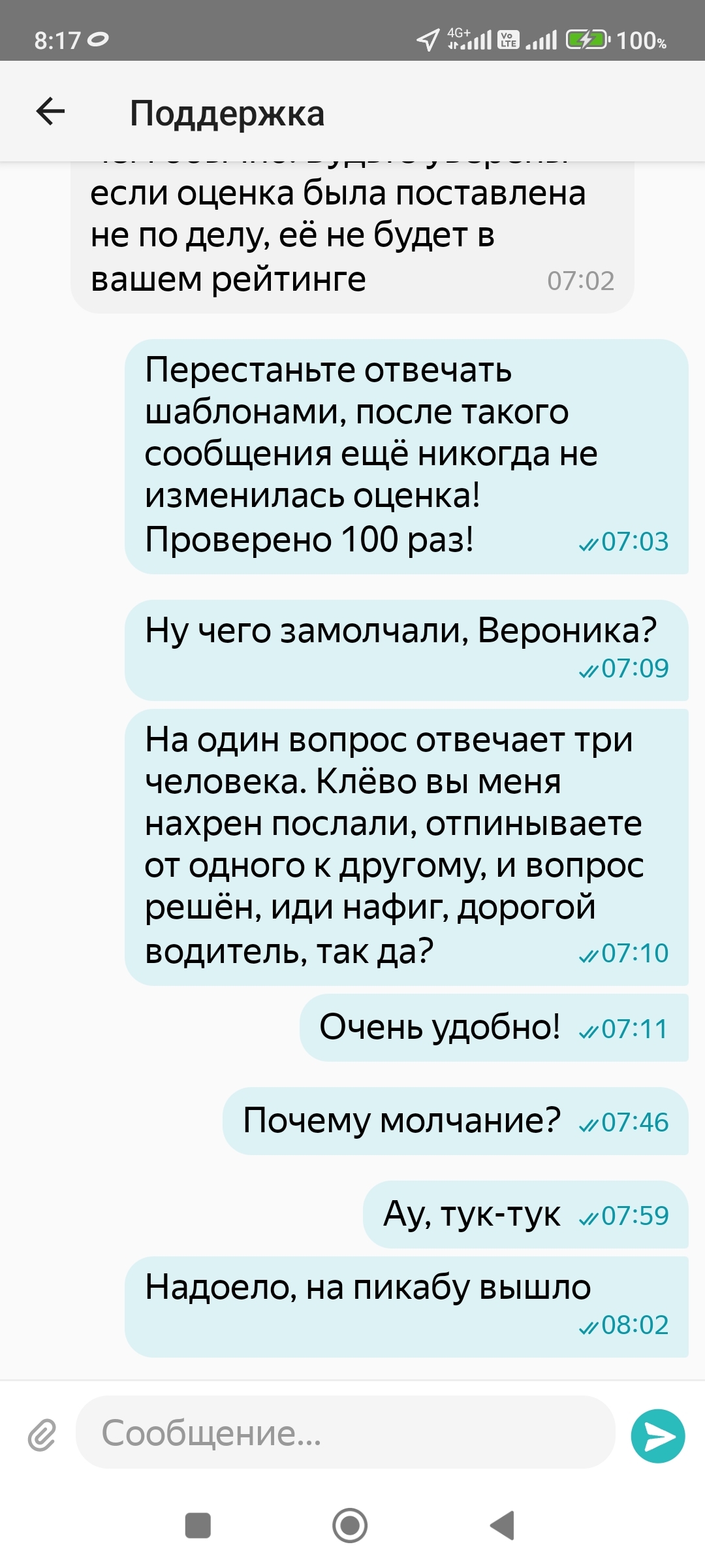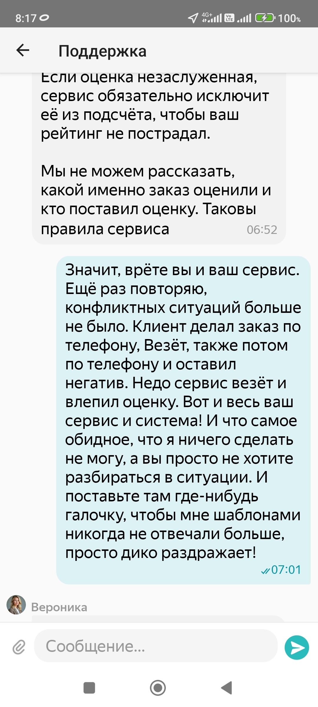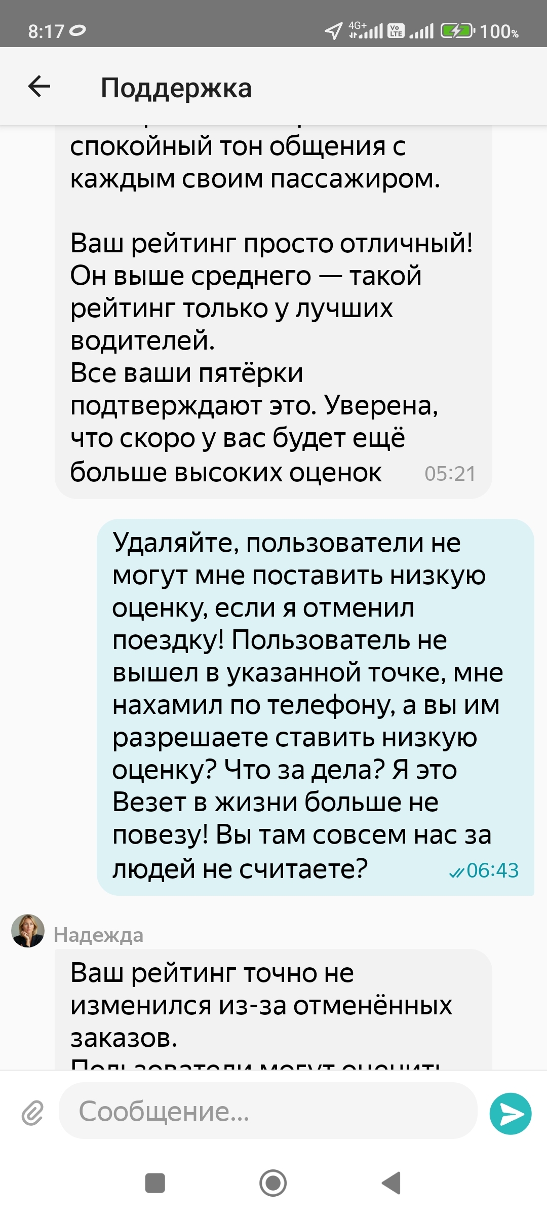 При этом, по всему городу реклама, как хорошо работать в Яндекс такси. Они вас любят. А потом пизтуй и работай! О сути конфликта, был вызов в одну точку, клиентка стояла в другой, на первый дозвон спросила, из какого такси, услышав, повесила трубку. На второй не ответила. На третий начала хамить, что я не там стою. Не хамила, приехал бы, там рядом, сказал ну ждите тогда. Пригрозила плохим отзывом. Т.к. уже можно было отменить без санкции, то просто отменил и всё. А с утра минус в рейтинге. Всё, что надо знать от ТП Яндекс. Нафиг они вообще нужны, такие помощники?