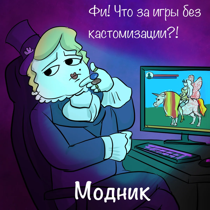 Игра без кастомизации перса? Что за бред? Играть за стрёмного орка или дворфа? Увольте. Стандартный скин терра? Для лохов. Это у него прекрасная эльфийка в уникальном шмоте рассекает по миру на розовом единороге, это он подбирает оружие в тон ботинкам перса, и может пожертвовать дефом брони, если она не достаточно красивенькая. Он три часа создаёт правильную форму глаз и груди для своего персонажа, чтоб через 20 минут игры понять, что лучником он играть не хочет, и всё по кругу. Он готов рвать жопу в данже только если там можно выбить уникальный шмот. И это он покупает скины, краски, а ещё часами может сидеть у парикмахера, подбирая причёску персу. Когда остальные просто надевают стандартную маску на миссию, это он выбирает между розовой гориллой и беленьким котиком. А его виртуальный дом выглядит как музей.