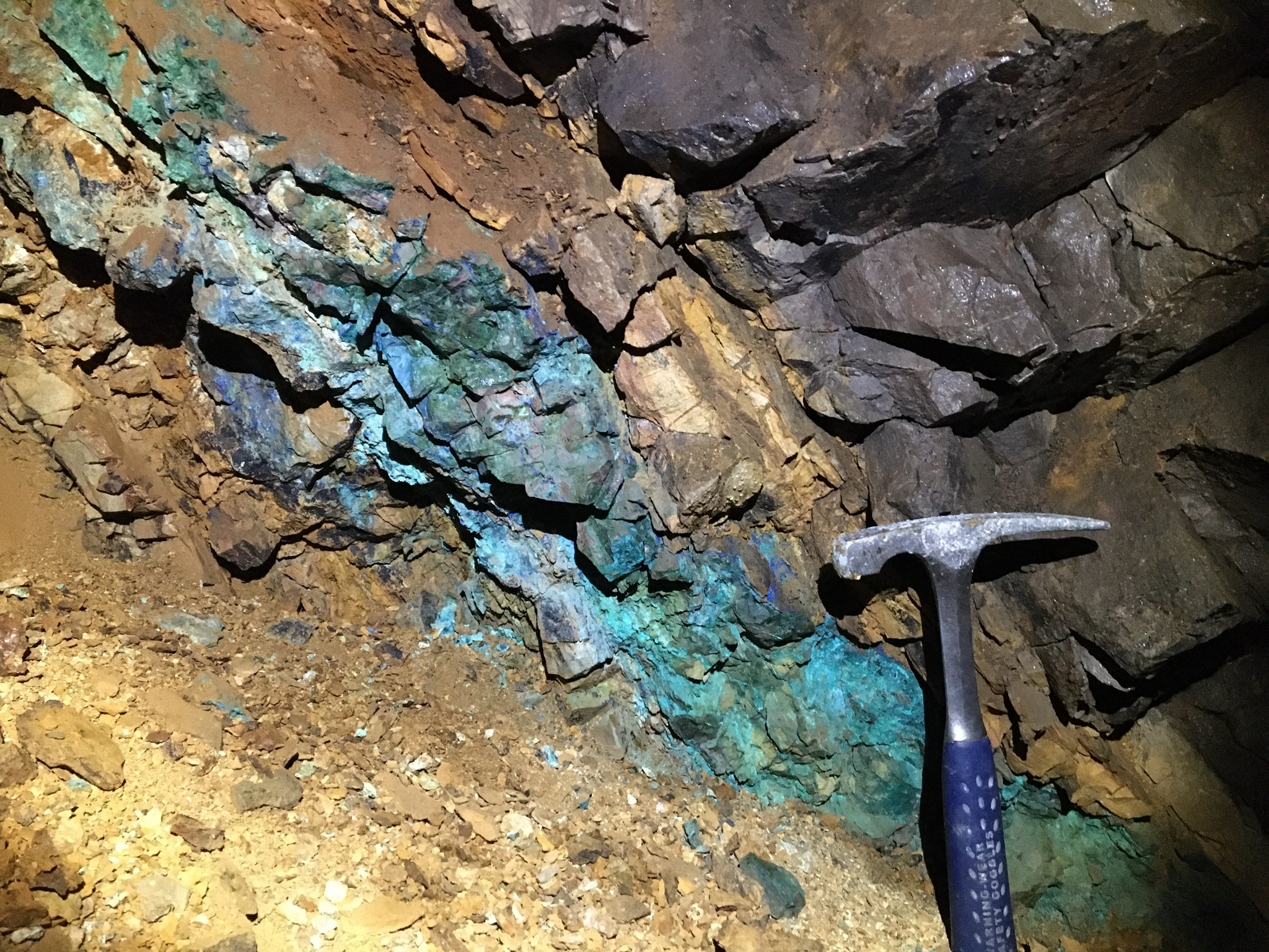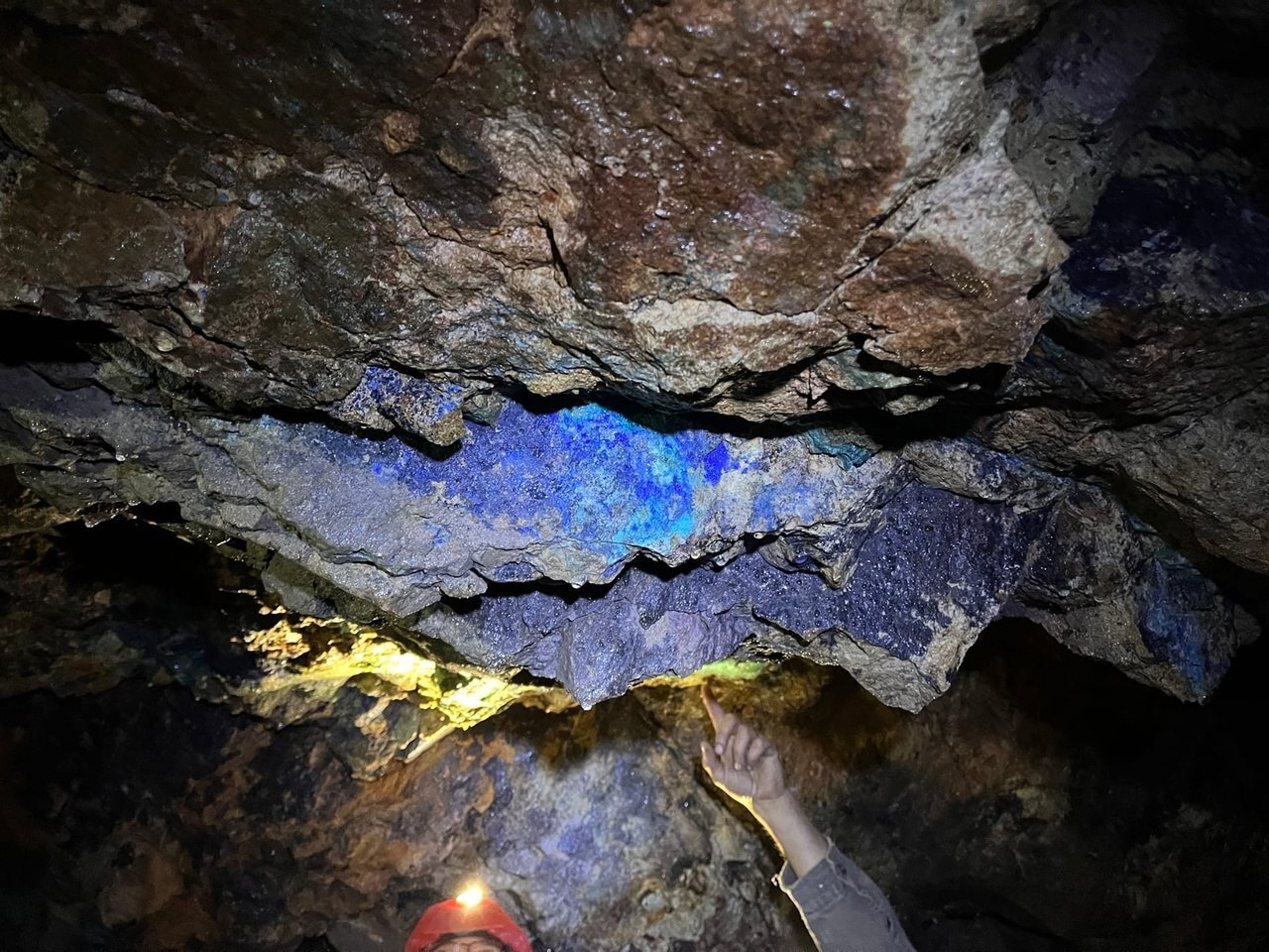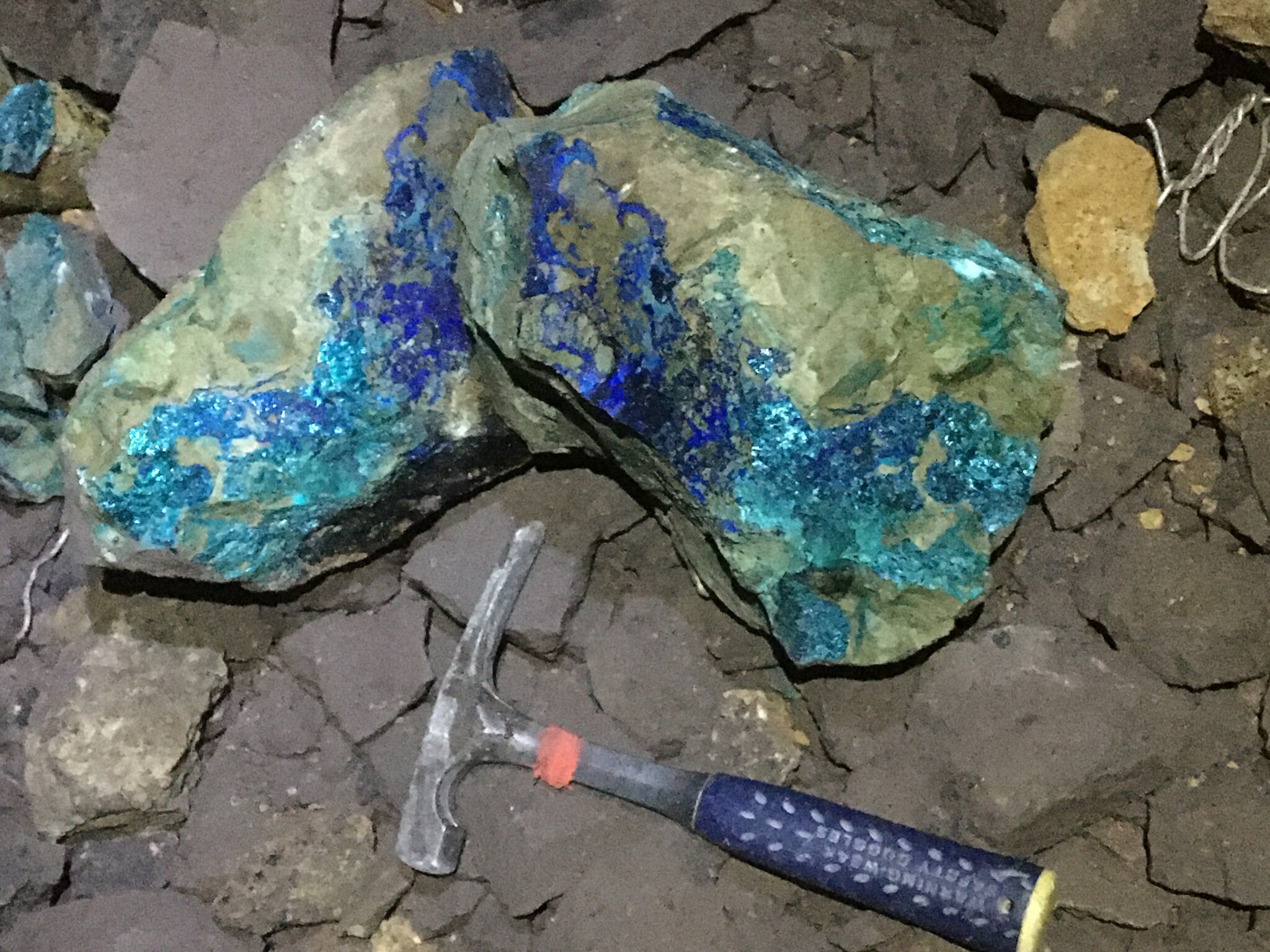 В штольне: Жила, содержащая блеклые руды и халькозин (черное), голубовато-зеленый тиролит и синий азурит.