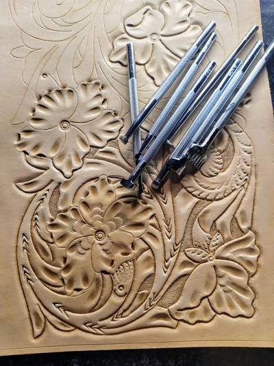 Кожа увлажняется, прорезается верхний слой кожи поворотным ножом, затем линии прорабатываются штампами при помощи киянки. В общем, очень длительный и медитативный процесс. Зато сделать можно практически что угодно)