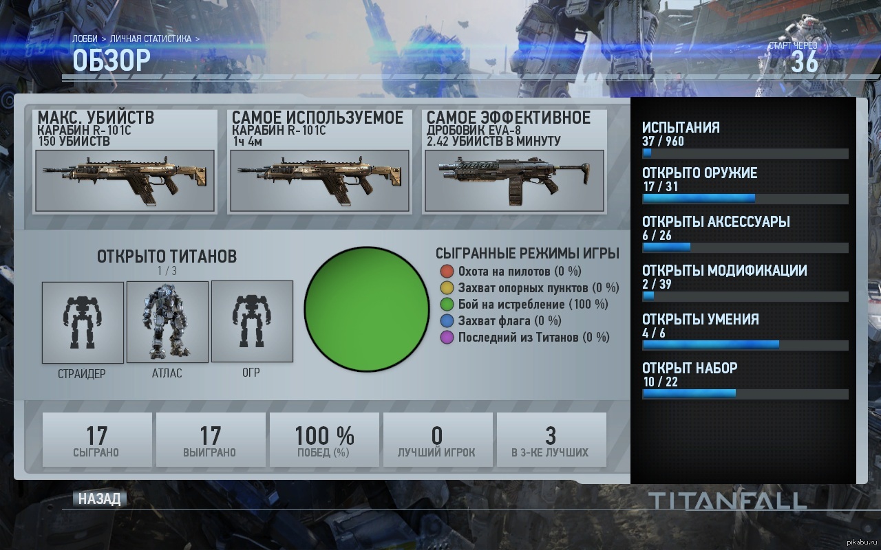 exomplex Titanfall 11 лет назад Раздавали бесплатно эту хорошую игрушку, решил поиграть, результат меня устраивает Titanfall 100% побед