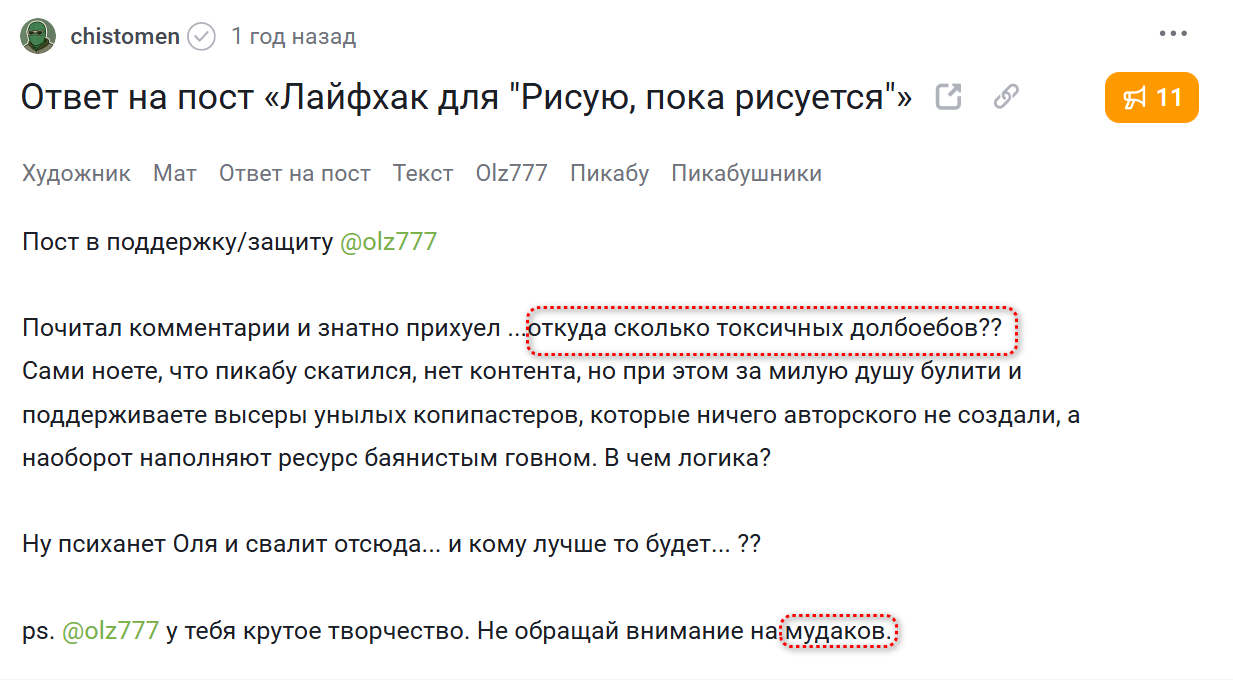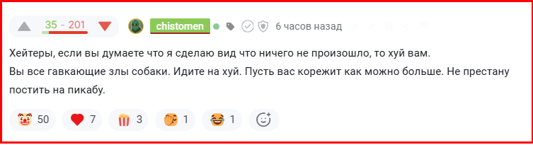 Чистомен даже перестал публиковаться по собственным тегом плашки «Топовый автор» у последних 6-7 постов нет. Настолько он стал токсичным.