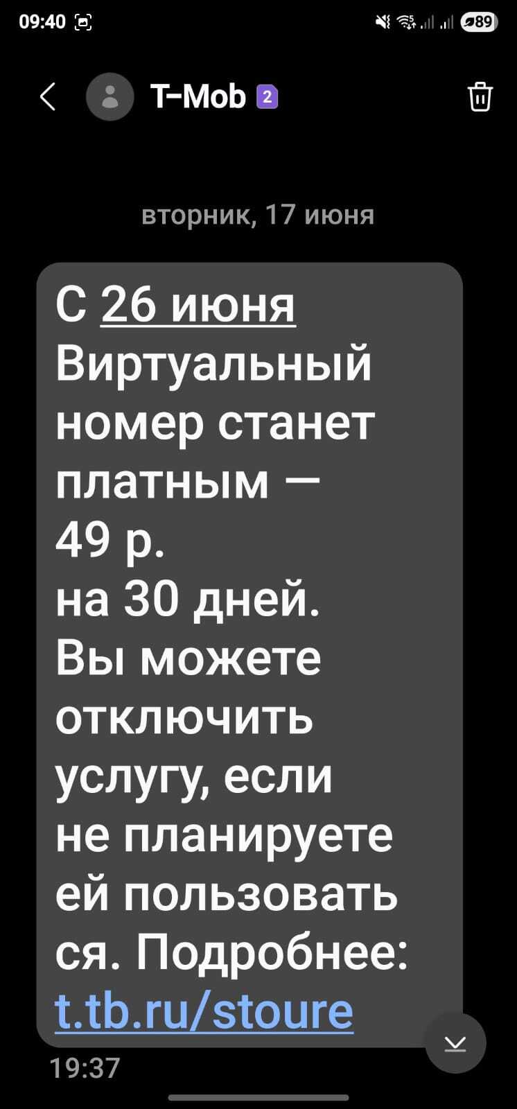 Но 17 июня пришло сообщение, что с 26 июня виртуальный номер станет платным. Я подумал, что это ошибка. Ведь обещали бесплатно и навсегда. Позвонил оператору Т-Мобайл и объяснил ситуацию. Оператор зачитал договор, ранее мной прочитанный, в котором говорилось, что компания может менять тарифы по своему усмотрению. Я возразил, что «Тинькофф» всегда выполнял свои обещания. Оператор ответил, что руководству компании нужно развиваться, поэтому они сделали обещанные бесплатные услуги платными.