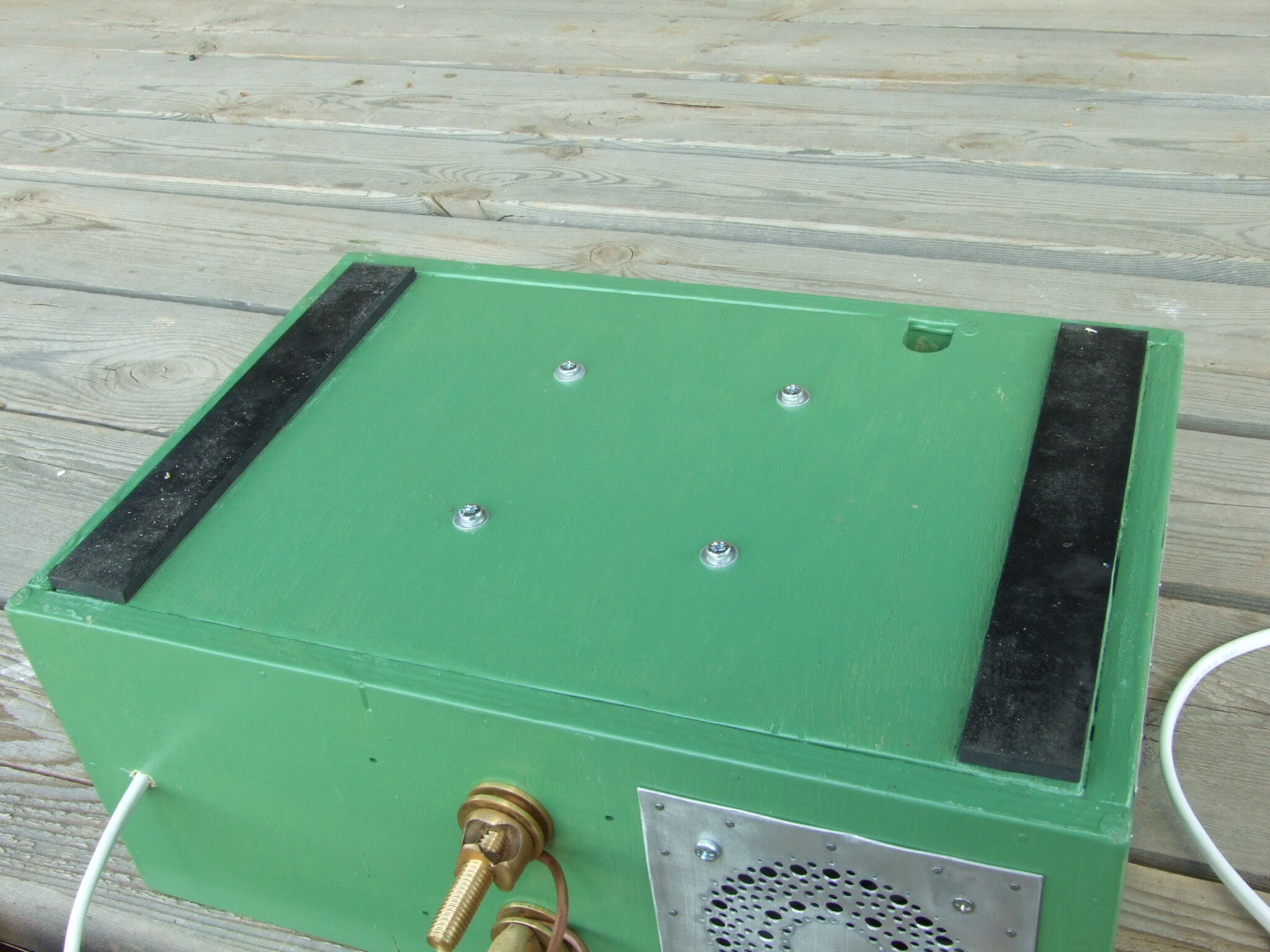 В сборе, блок планируется как столик-подставка для нахлобученного сверху некрупного рычажного прижима (электродов). Отсюда незакрепленная верхняя крышка – придавится, и клеммы сзади.