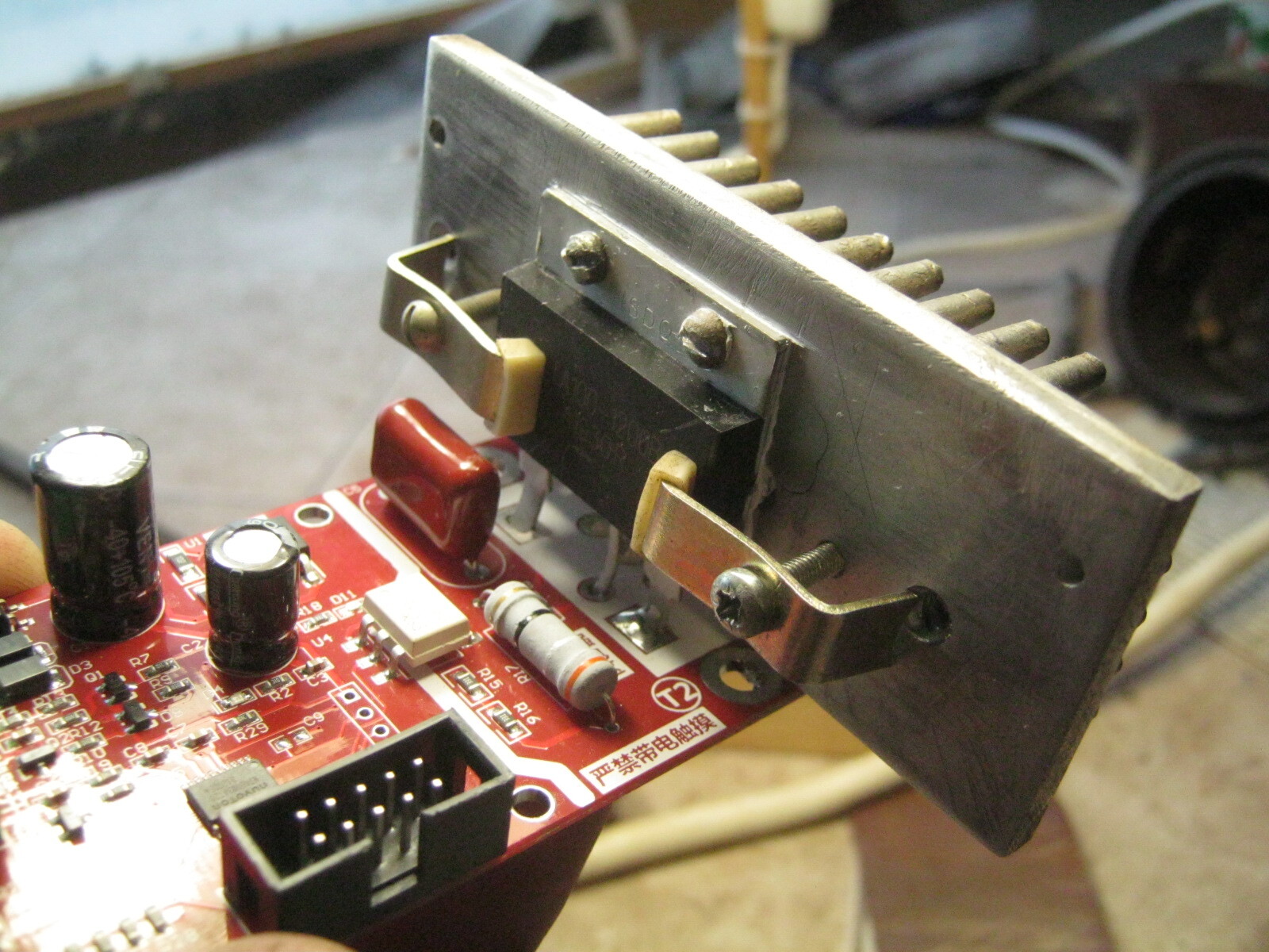 Просверлил радиатор, нарезал резьбу. Прикрутил прибор за фланец, корпус дополнительно прижал парой нашедшихся кронштейнов. Под металлическую спину симистора плюхнул немного КТП-8.