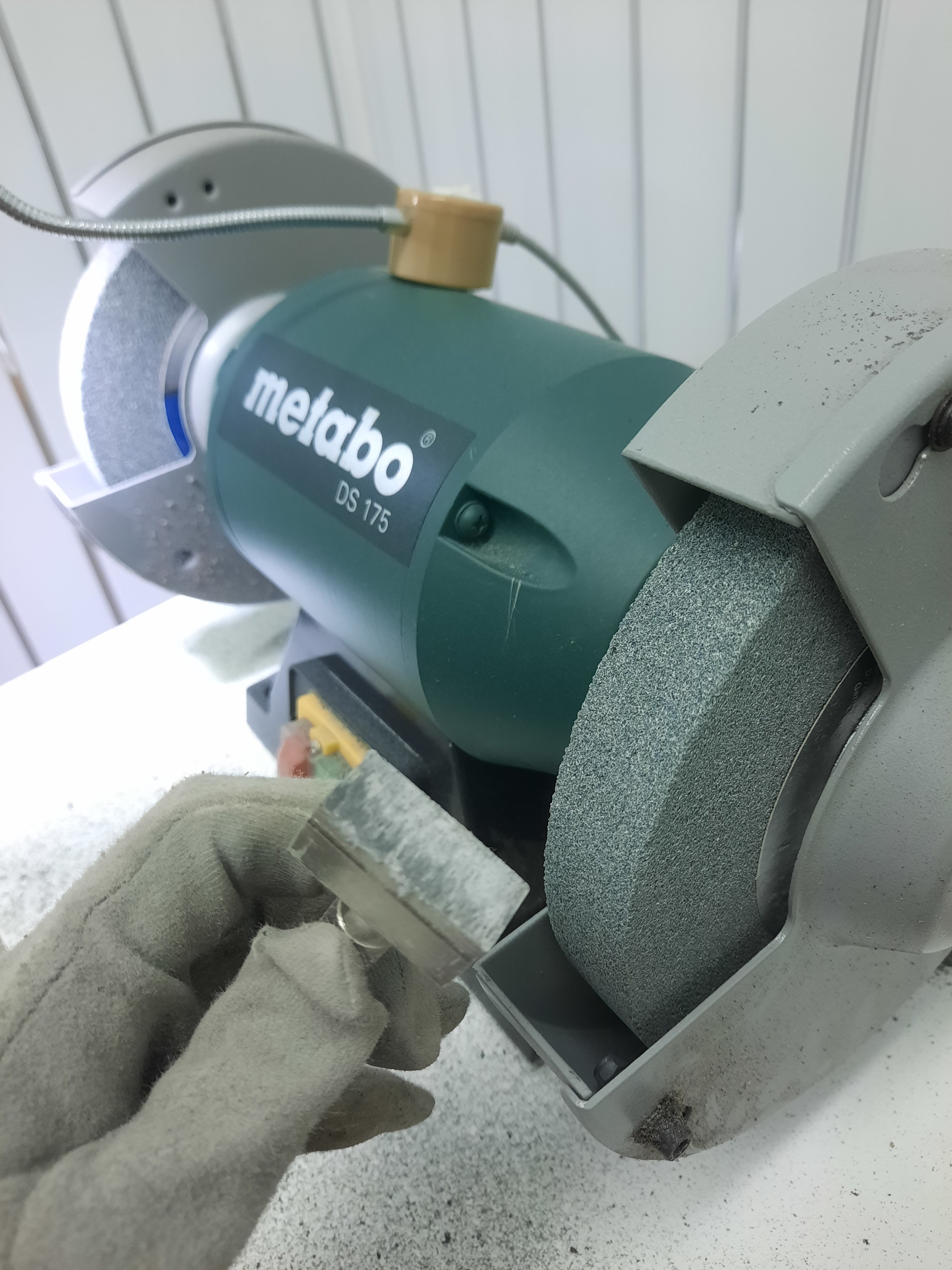 Всем привет! 👋 Круги сильно залипли клеем. На этом станке я обрабатываю ремешки для часов из кожи морского ската. Клей налипает после каждого ремня. Вот алмазный карандаш за 400 рублей обновил абразив, можно работать дальше. Единственное, есть небольшой угол наклона, так как прижим неодинаковый при правке. Подскажите, кто как крепит алмазный карандаш, чтобы угол был точный?