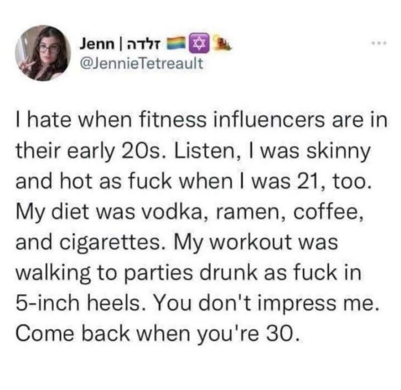 Ненавижу, когда популярные фитнес-инструкторы немногим старше 20 лет. Послушайте, когда мне был 21 год, я тоже была тощая и чертовски сексапильная. Моя диета состояла из водки, лапши быстрого приготовления, кофе и сигарет. Из физических упражнений было хождение по вечеринкам пьяной вдрабадан на 12-сантиметровых каблуках. Вы меня не впечатляете. Возвращайтесь, когда вам стукнет тридцатник.