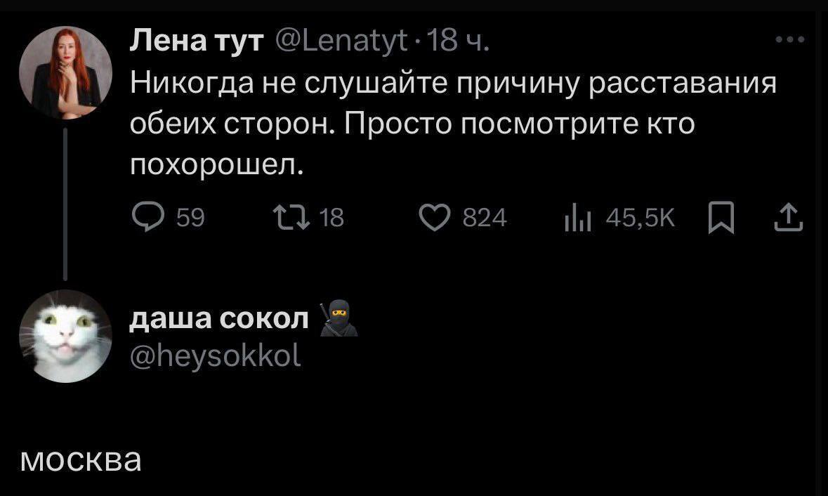 335 KOPOBOPOTEHb ВЫХУХОЛЕВОПЛОЩЁННЫЙ Баяны Отношения Только о Москве и думает 2 дня назад Из сети Юмор Мужчины и женщины Отношения Расставание Москва Скриншот 43 3 2 1 Ещё 0