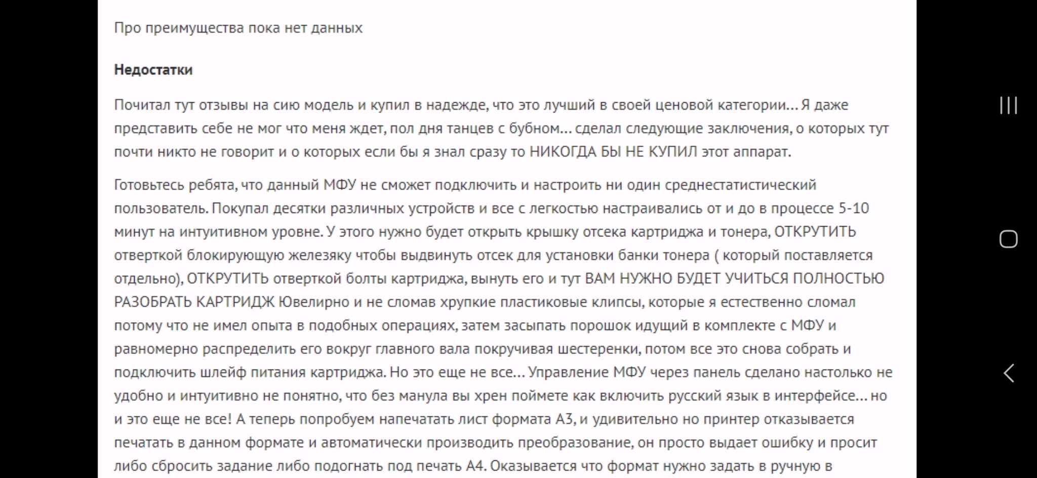 Готовьтесь ребята, что данный МФУ не сможет подключить и настроить ни один среднестатистический пользователь. Покупал десятки различных устройств и все с легкостью настраивались от и до в процессе 5-10 минут на интуитивном уровне. У этого нужно будет открыть крышку отсека картриджа и тонера, ОТКРУТИТЬ отверткой блокирующую железяку чтобы выдвинуть отсек для установки банки тонера ( который поставляется отдельно), ОТКРУТИТЬ отверткой болты картриджа, вынуть его и тут ВАМ НУЖНО БУДЕТ УЧИТЬСЯ ПОЛНОСТЬЮ РАЗОБРАТЬ КАРТРИДЖ Ювелирно и не сломав хрупкие пластиковые клипсы, которые я естественно сломал потому что не имел опыта в подобных операциях, затем засыпать порошок идущий в комплекте с МФУ и равномерно распределить его вокруг главного вала покручивая шестеренки, потом все это снова собрать и подключить шлейф питания картриджа. Но это еще не все... Управление МФУ через панель сделано настолько не удобно и интуитивно не понятно, что без манула вы хрен поймете как включить русский язык в интерфейсе... но и это еще не все! А теперь попробуем напечатать лист формата А3, и удивительно но принтер отказывается печатать в данном формате и автоматически производить преобразование, он просто выдает ошибку и просит либо сбросить задание либо подогнать под печать А4. Оказывается что формат нужно задать в ручную в настройках, которые я пол часа искал и нигде об этом не сказано. Это просто трешь, такой тупой аппарат я в -первые в жизни встречаю. Плюс у него нет интерфейса LAN из коробки, нужно заказывать плату расширения отдельно за 7 000. Не работает кнопка "Сканировать" на панели управления вообще!! (подозреваю, пока не купить плату расширения)