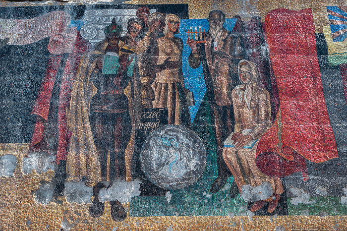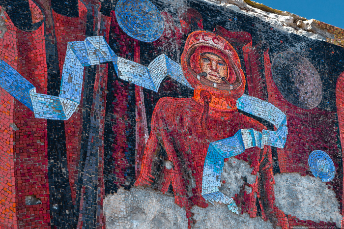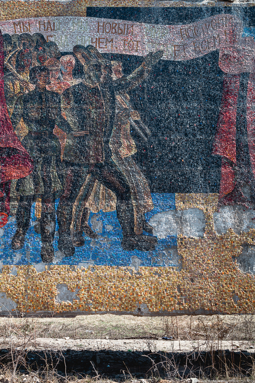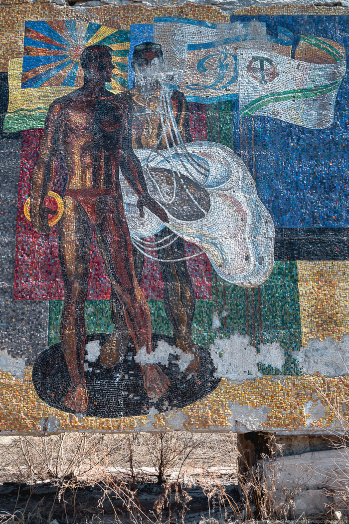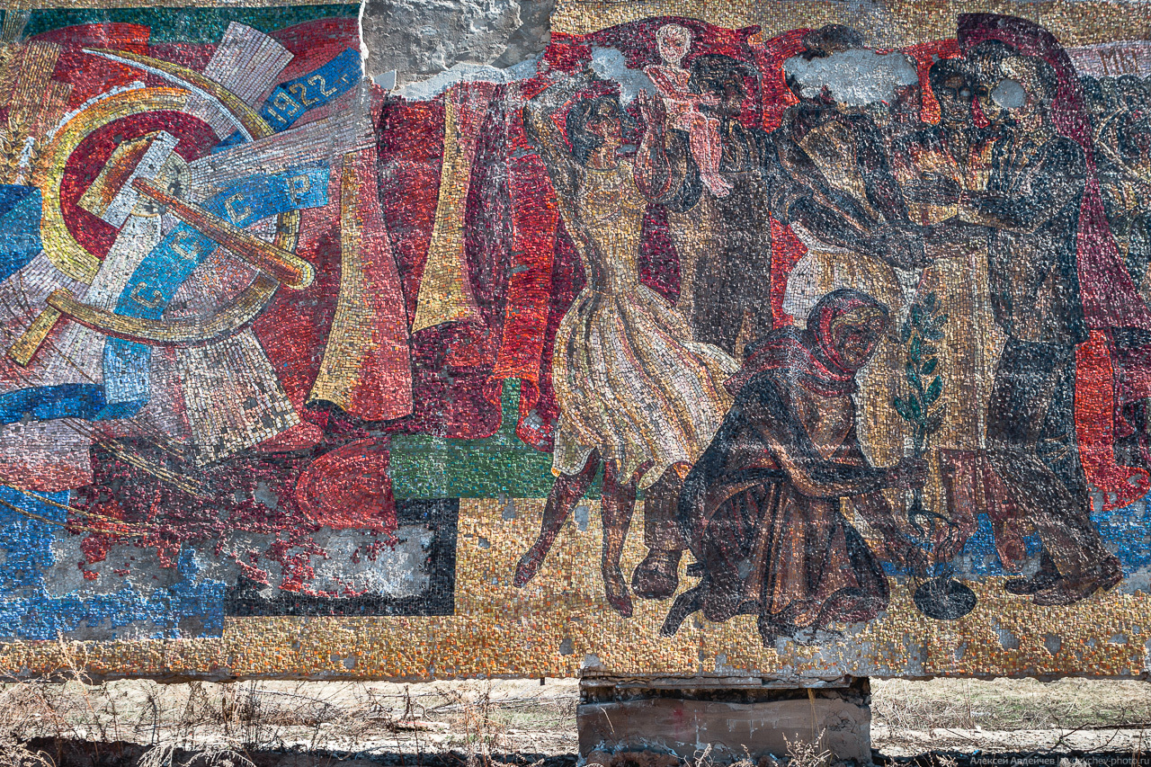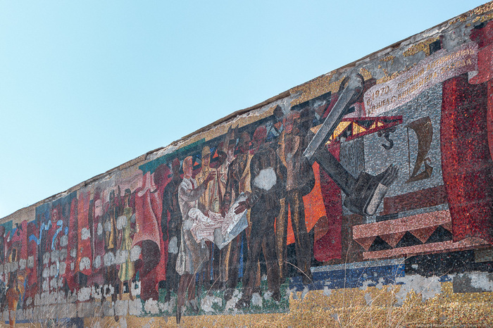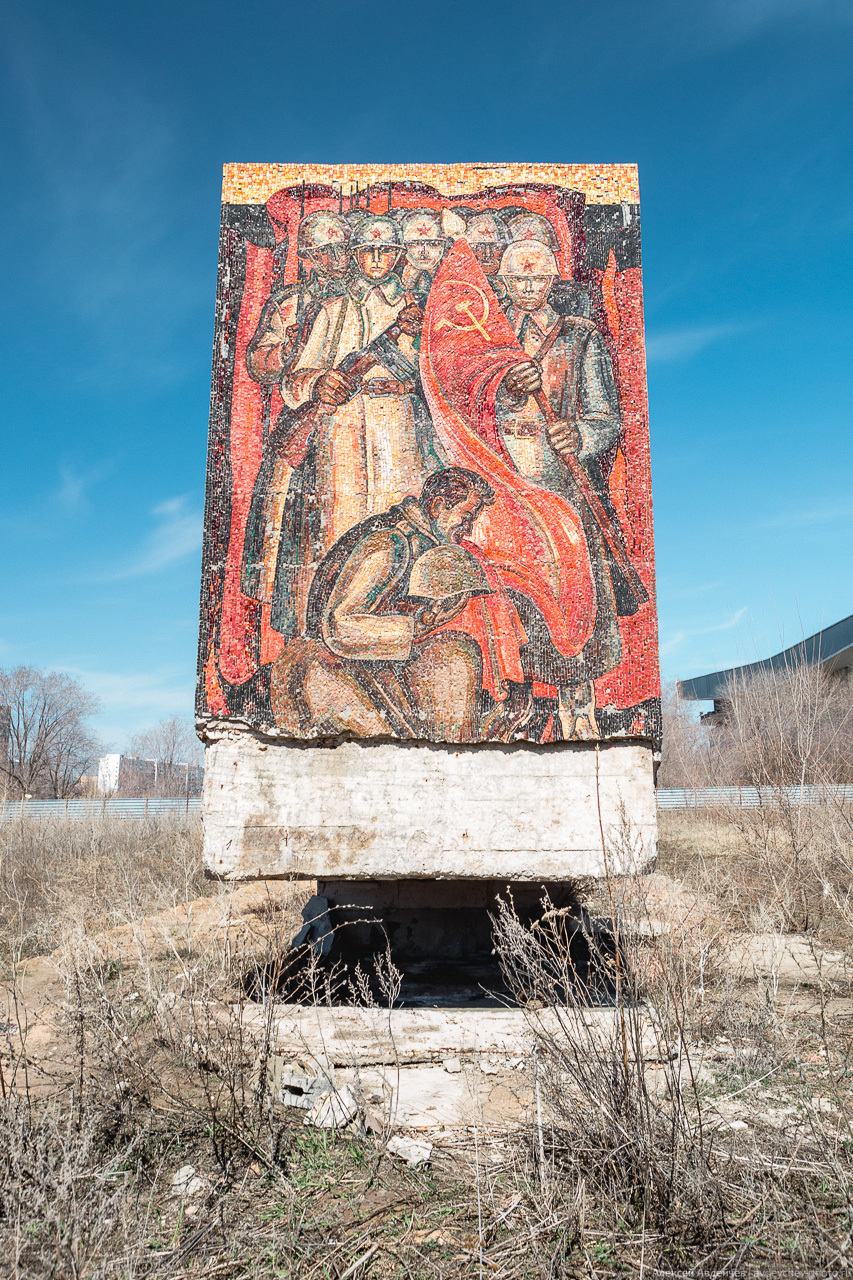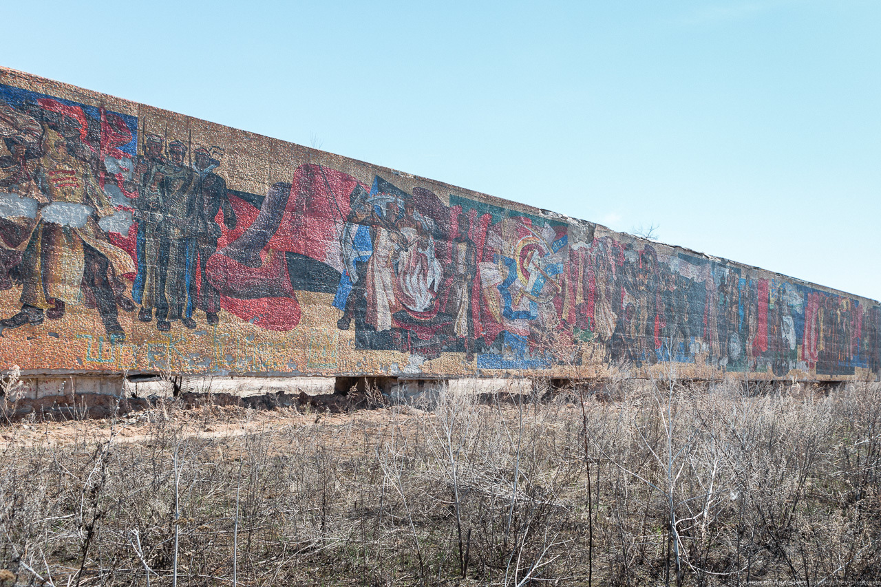 Стела-панно заросла сорняками и постепенно разрушается временем, которому периодически помогают вандалы.
