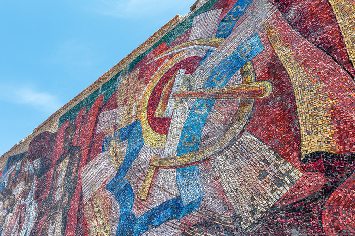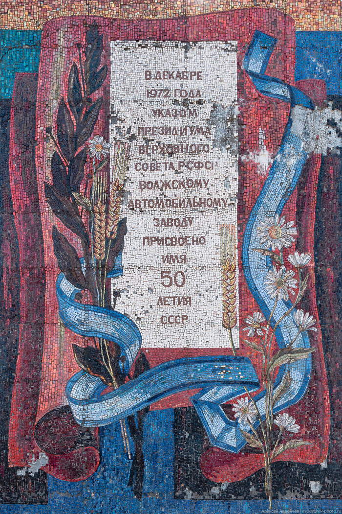 Мозаичная стела-панно "Радость труда" - одна из главных достопримечательностей Тольятти, которая, при всей своей уникальности, довольно давно пребывает в заброшенном состоянии. Сюжеты, изображённые с четырёх сторон стелы-панно посвящены таким достижениям советского государства, как социалистическая революция, создание Рабоче-крестьянской Красной Армии, ликвидация безграмотности, победа российского народа в Великой Отечественной войне, первый выход человека в космос, строительство города Тольятти и Волжского автомобильного завода. Стела-панно "Радость труда" (первоначальное название - стела "55-летия СССР") имеет впечатляющий размер - 100 метров в длину, 5 метров в высоту и 3 метра в ширину. Объект создавался 4 года (с 1977 по 1981 г.), общая площадь мозаики - 530 квадратных метров. Для стелы понадобилось более трёх с половиной миллионов отдельных элементов смальты (около 100 оттенков).