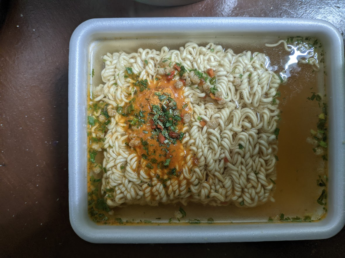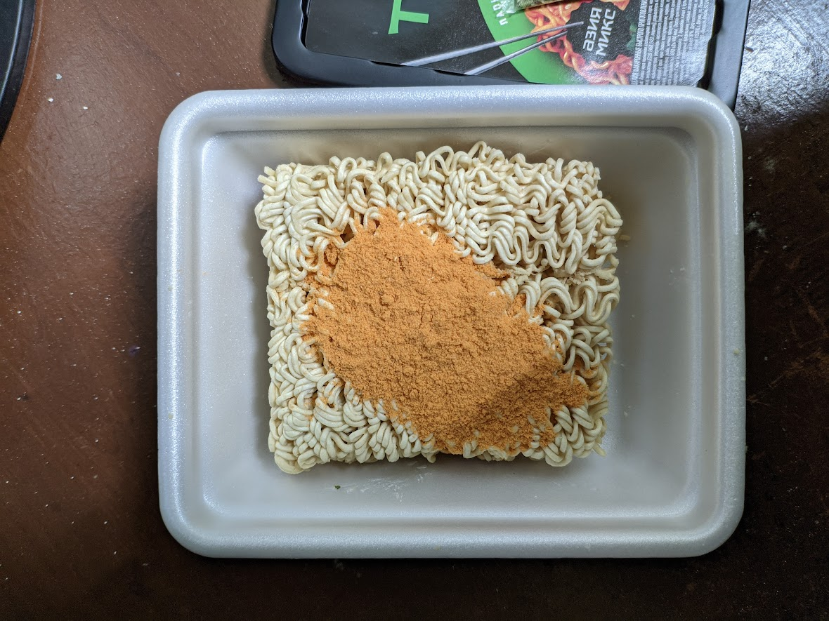Сырая лапша по вкусу похожа на доширак. Суповая основа немного острая, с выраженным лимонным и креветочным вкусом, намного интереснее чем у Лисичкиного доширака. Высыпаем всё в лапшу, заливаем кипятком и закрываем крышкой