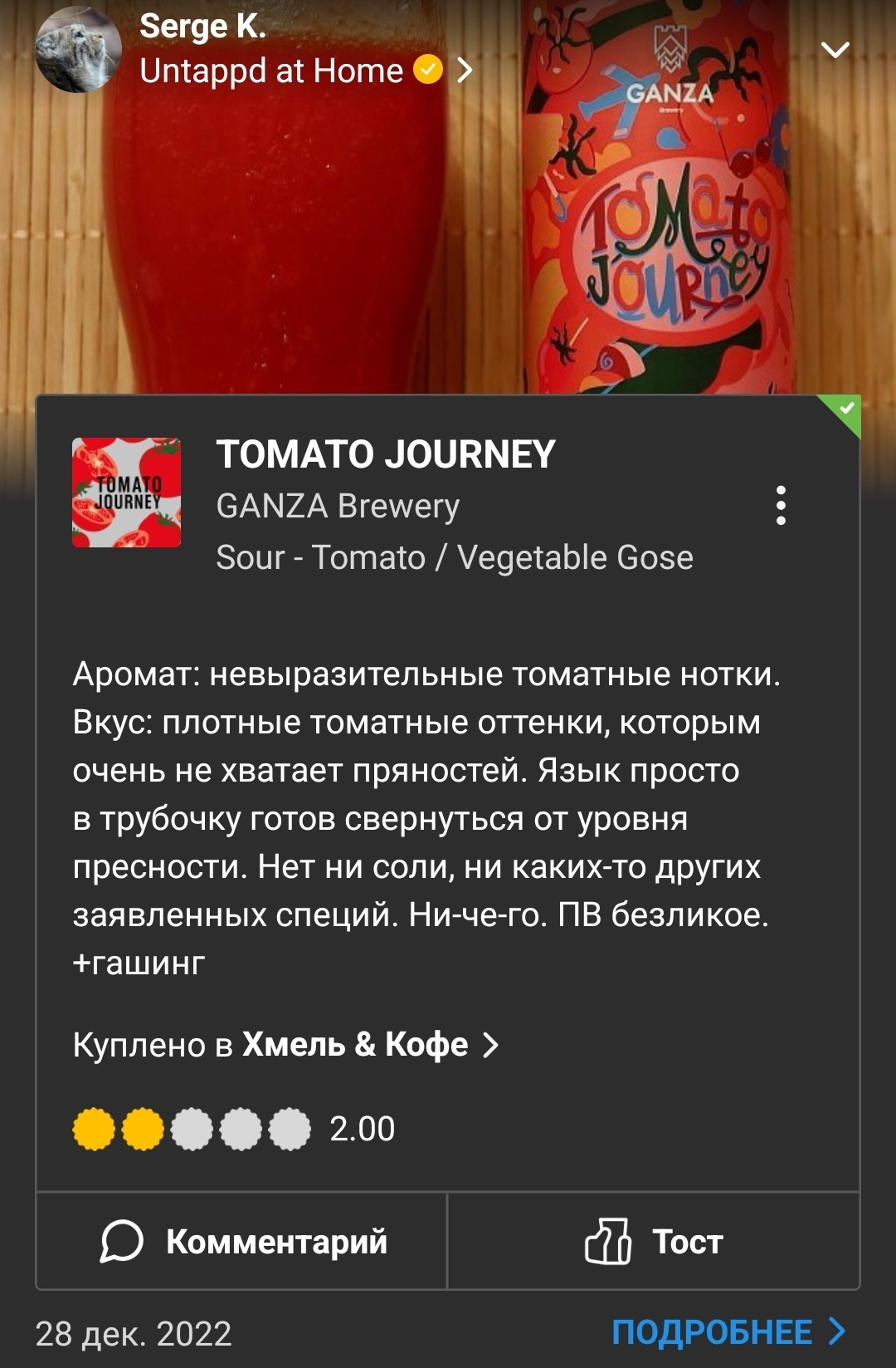 Любителям томатных гозе из категории "шоб вставило" Kimjang определённо понравится, но для обывателей он покажется чрезмерно острым. К слову, в Untappd больше всего отзывов именно об этом.