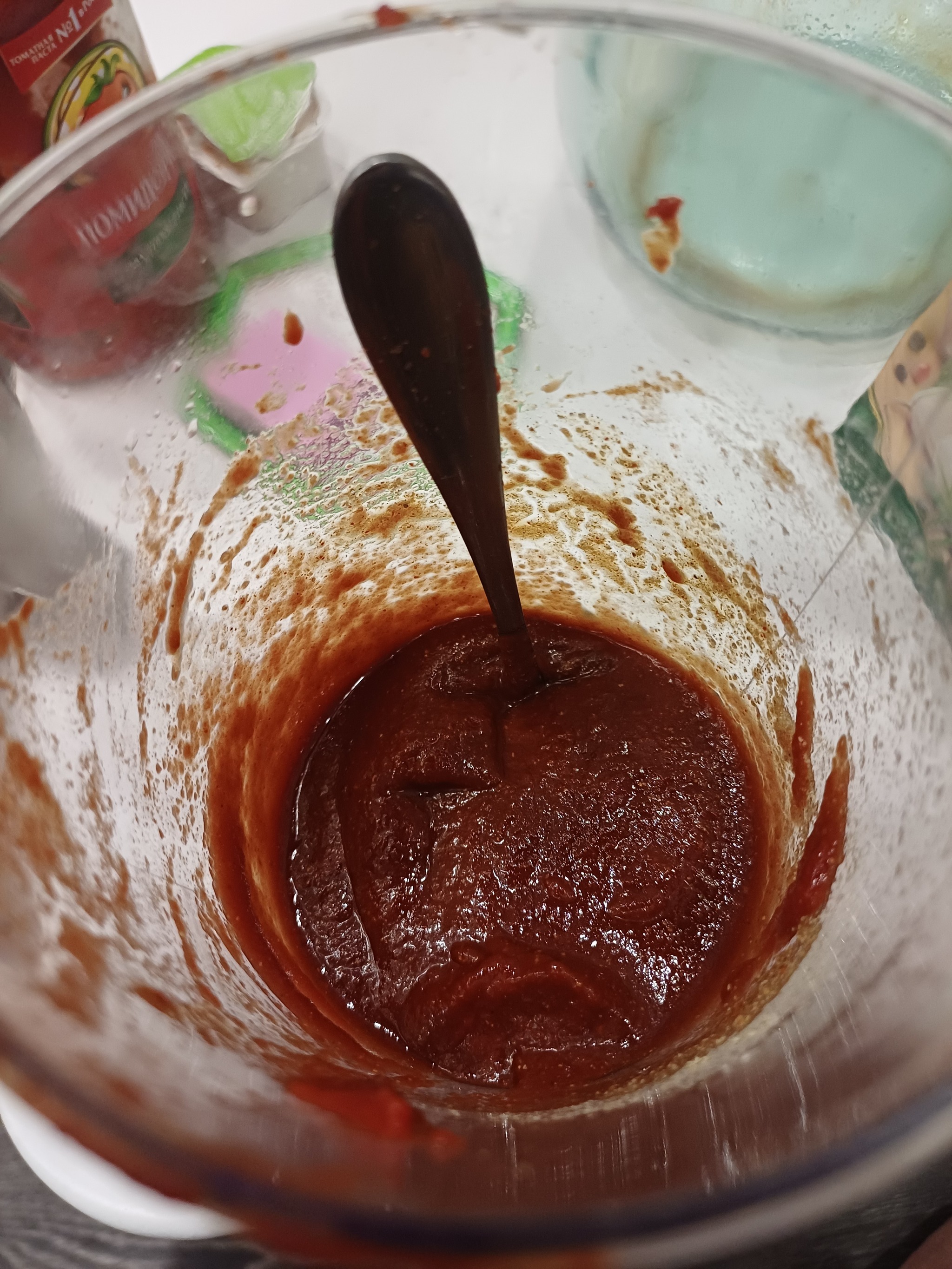 Совет:когда пасту с мерника перекинули в банку, мерник можно промыть пивом, то есть налить пиво размешать и вылить в банку. И так несколько раз. Так все специи и помидорки окажутся в банке и легче будет мыть мерник.